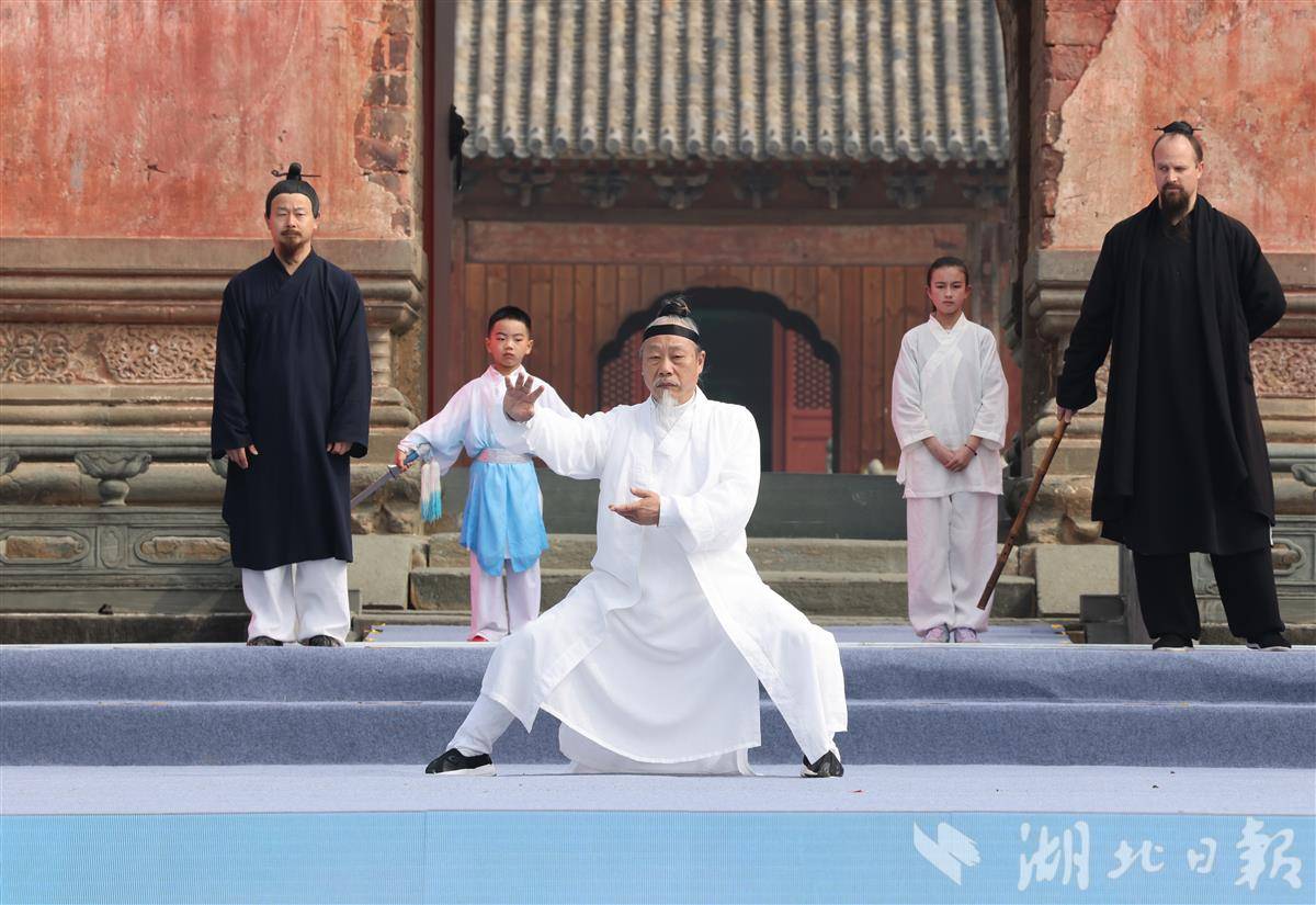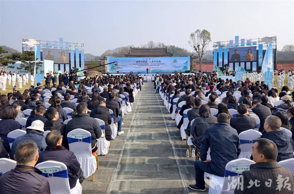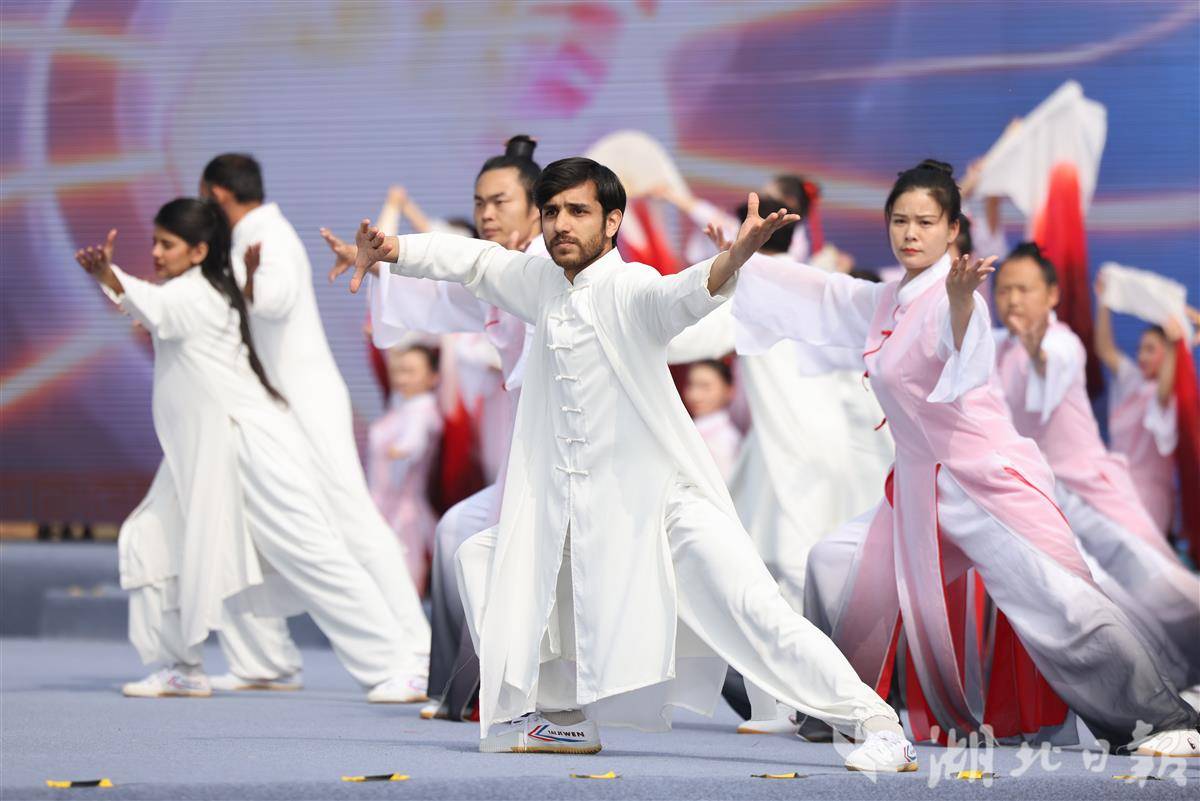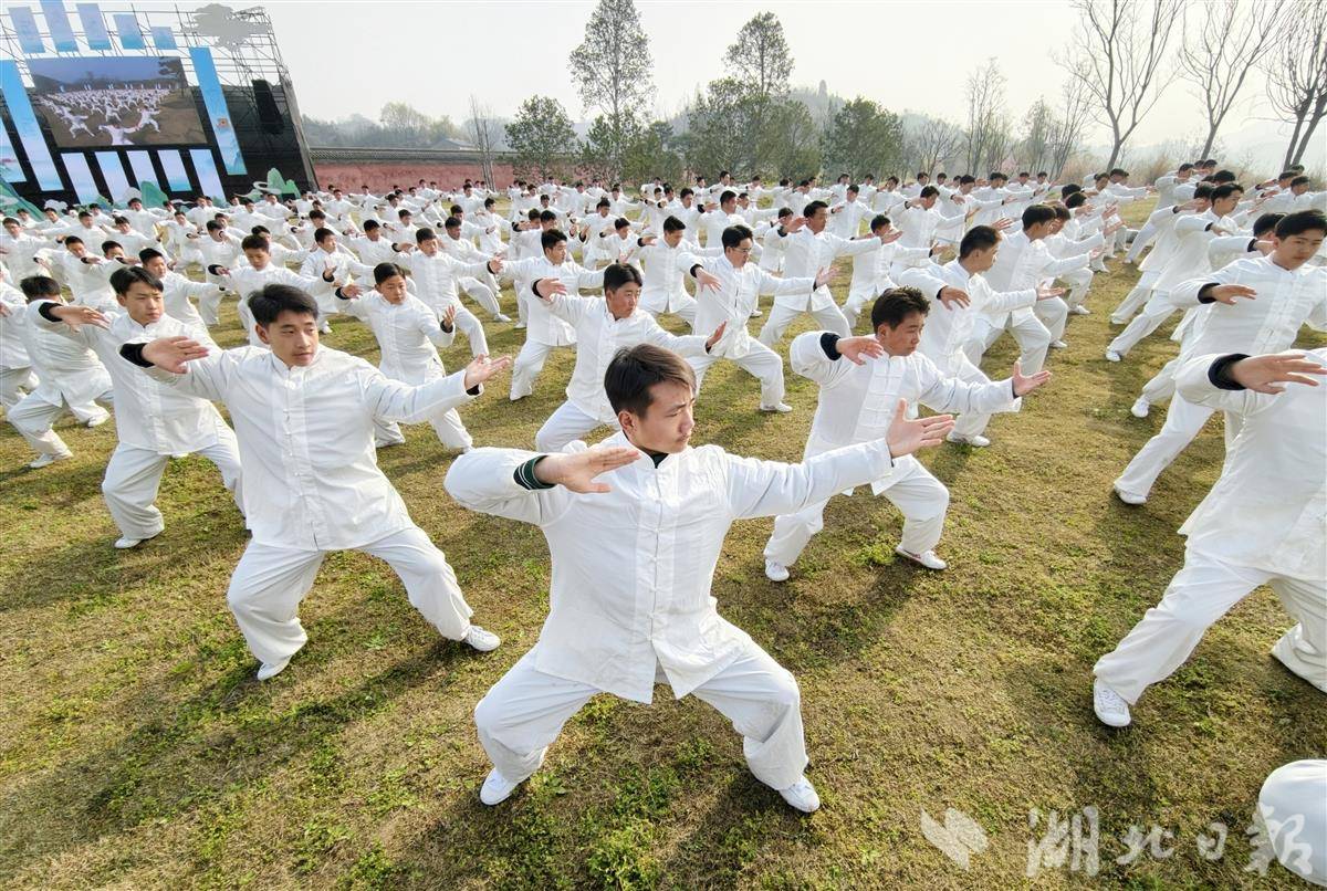 两手环抱、左右旋胯、架掌蹬脚……在武当山遇真宫广场,1000名身着白衫的太极拳习练者共同起势。同一时刻,以纽约时代广场、巴黎埃菲尔铁塔、悉尼歌剧院、埃及金字塔、莫斯科克里姆林宫、北京故宫、上海东方明珠、西安大雁塔等67个全球地标为背景,海内外太极拳爱好者“视频同框”起舞,链接起一场规模空前的太极文化全球接力和跨越山海的文化共鸣。