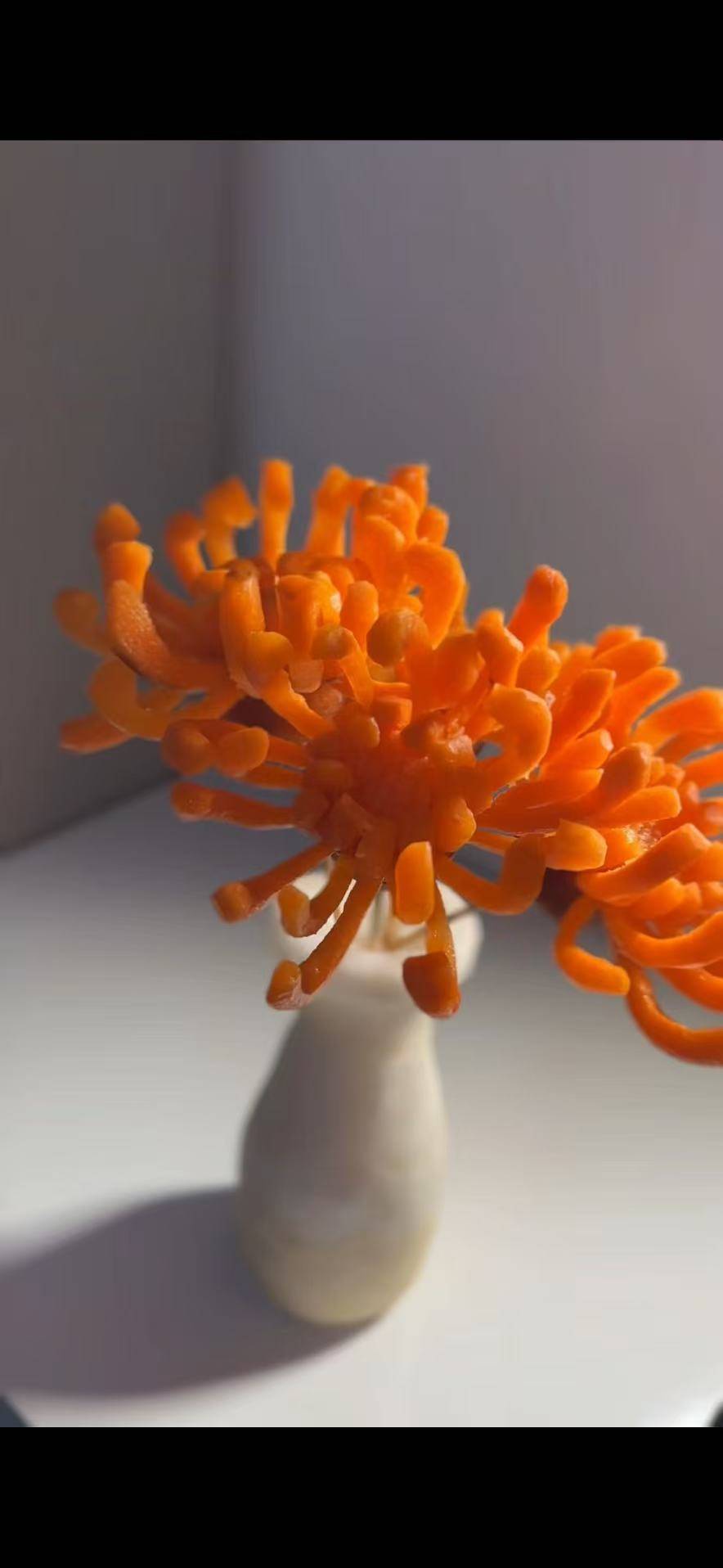 记者在现场看到,突出的“小兔牙”,成为她创作的天然优势,一个胡萝卜片被啃成一朵小巧的六瓣小花,费时约六七分钟。直播时,就在家中随意一角开播,仅有两盏补光灯打亮环境。