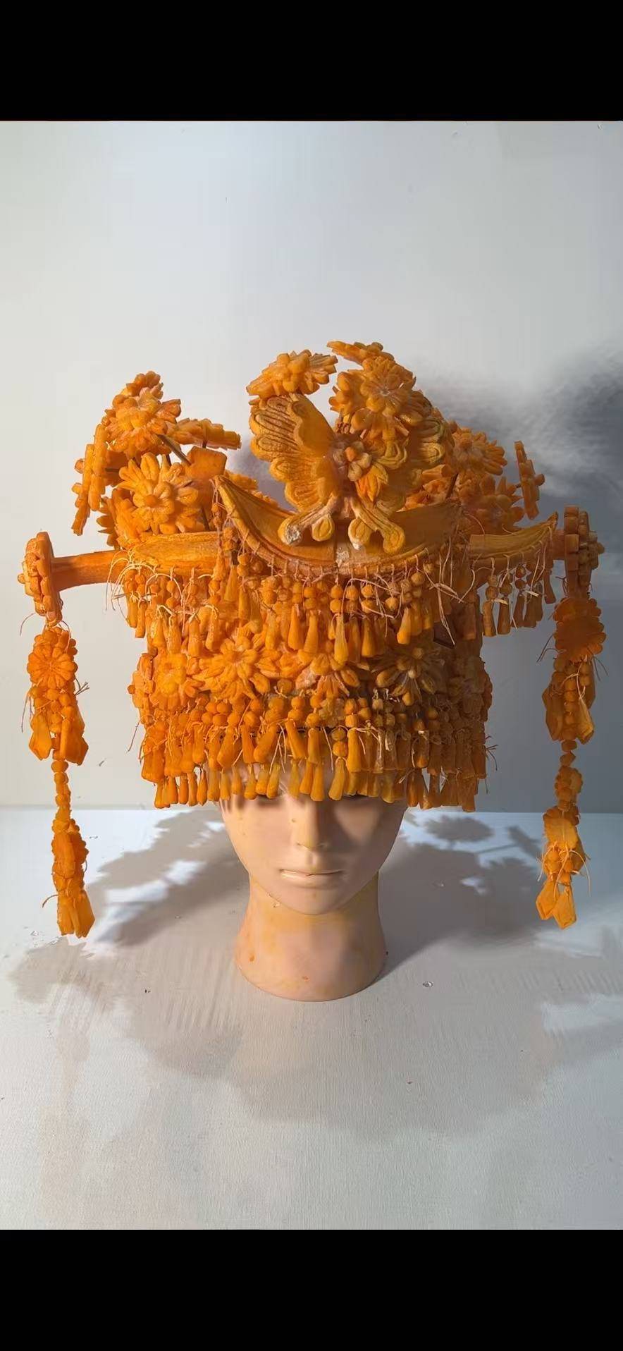 陈琴的创作方式以门牙为“刻刀”,仅在做复杂造型时提前将胡萝卜切片,后续轮廓、线条、层次、细节均靠牙齿慢慢啃制、打磨、修整。“作品部件都是用牙齿,仅需要拼接时用牙签、针线等工具。”陈琴介绍,在雕琢黄鹤楼、圆明园、苗族头饰前,她会认真查阅资料、研究结构,完成一部作品需要十天半月。其中苗族头饰耗时近一周,圆明园因承载历史意义,她格外注重细节打磨,前后花费十天左右。