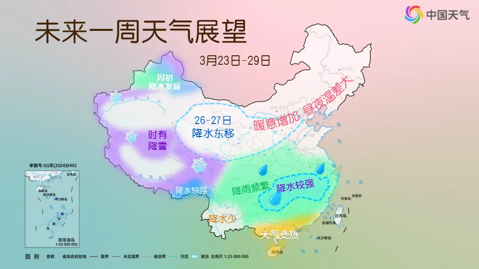 3月24日08时-25日08时,鄂西北、鄂西南、江汉平原南部、鄂东南、鄂东北南部小雨转多云;其他地区阴天到多云,局地有短时小雨。最高气温西部13~16℃、中东部16~20℃,最低气温8~12℃,偏北风3到4级、阵风5到6级,夜间转2到3级。