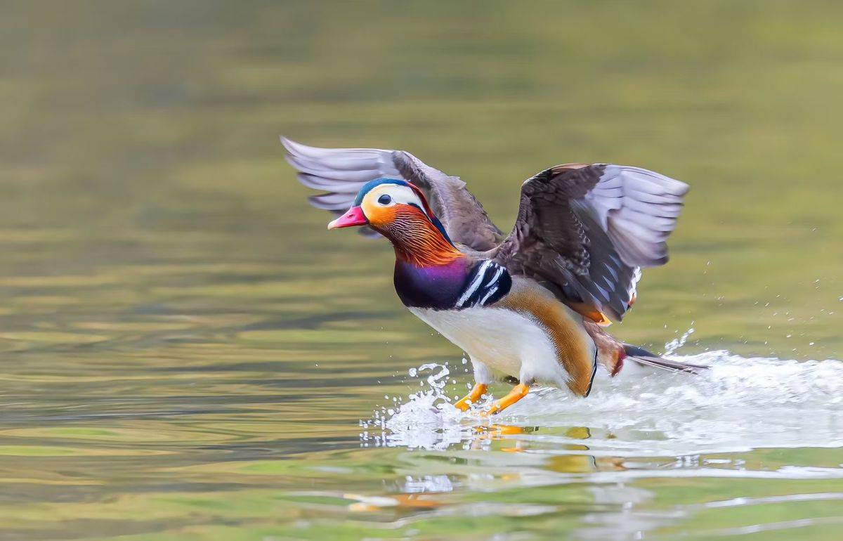 襄阳市保康县南河流域,国家二级保护野生动物鸳鸯展翅飞行。(荆山观鸟队供图)