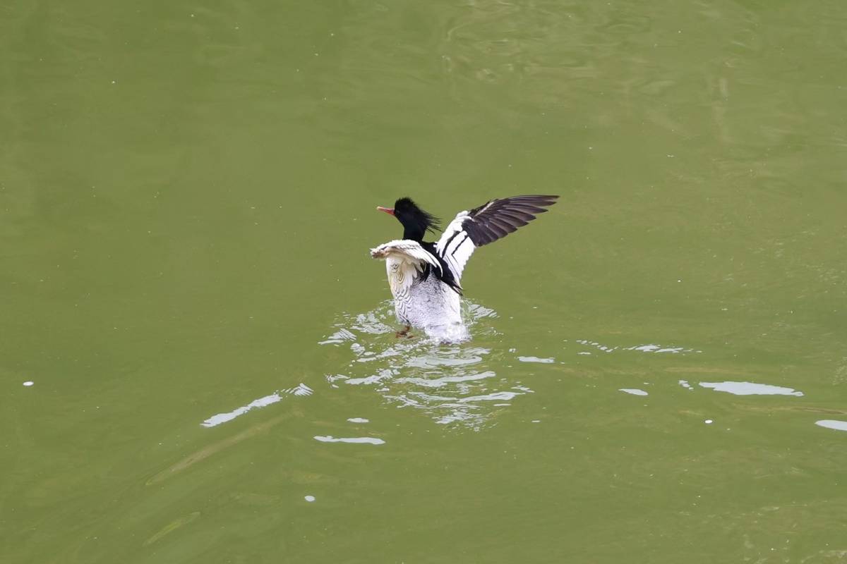 襄阳市保康县南河流域,国家一级保护野生动物中华秋沙鸭在水面展翅。(荆山观鸟队供图)