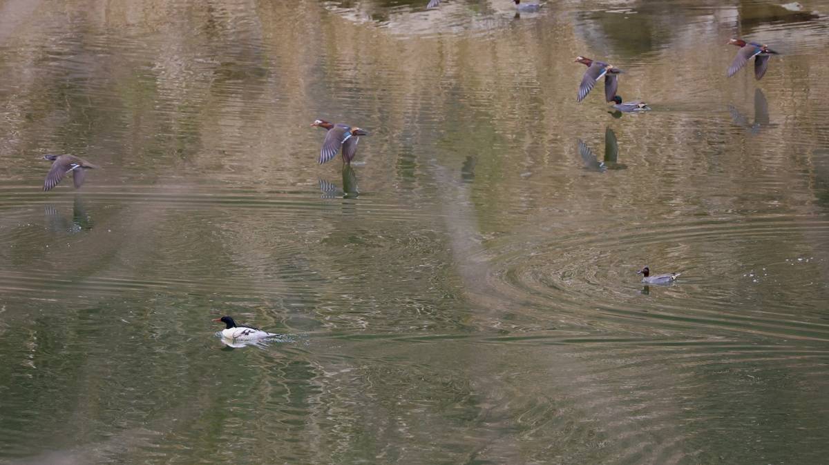画面中,鸳鸯成双成对、悠游自得,雄鸟羽衣华美、灿若云霞,雌鸟褐羽白眉、素雅温婉。中华秋沙鸭身姿优雅,它们时而逐浪清波、身姿矫健,时而振翅凌空、掠水飞翔,在南河碧波之上划出灵动弧线。