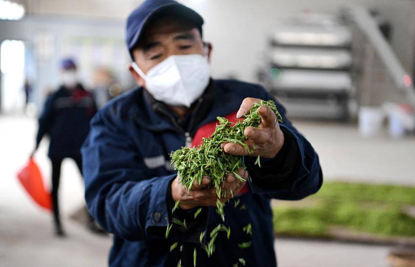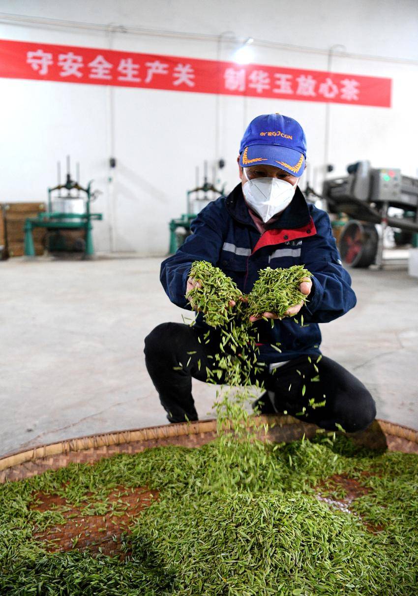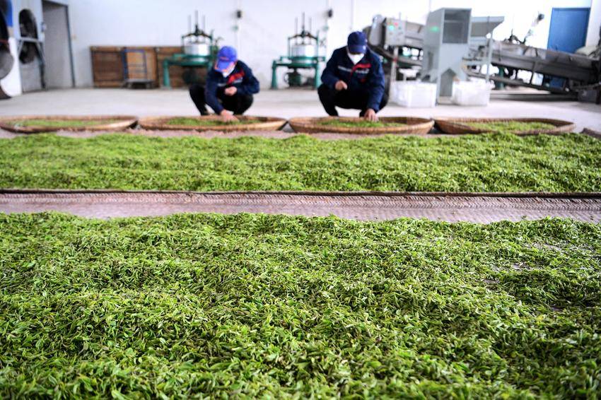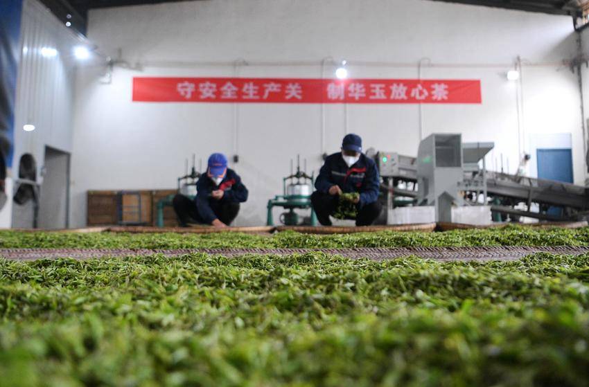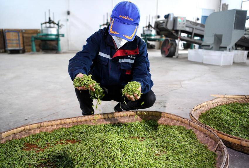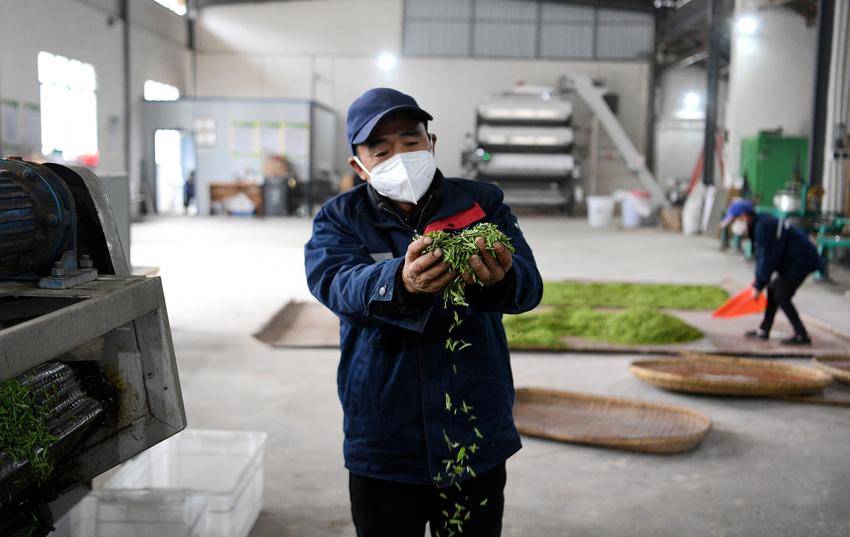 ▲▼3月26日,在保康县马良镇溪峪村茶叶加工厂,工人在摊晾“明前茶”。