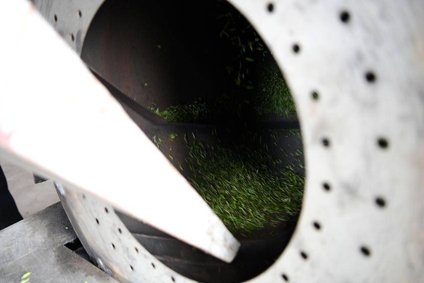 ▲▼3月26日,在保康县马良镇溪峪村茶叶加工厂,工人在察看“明前茶”杀青情况。