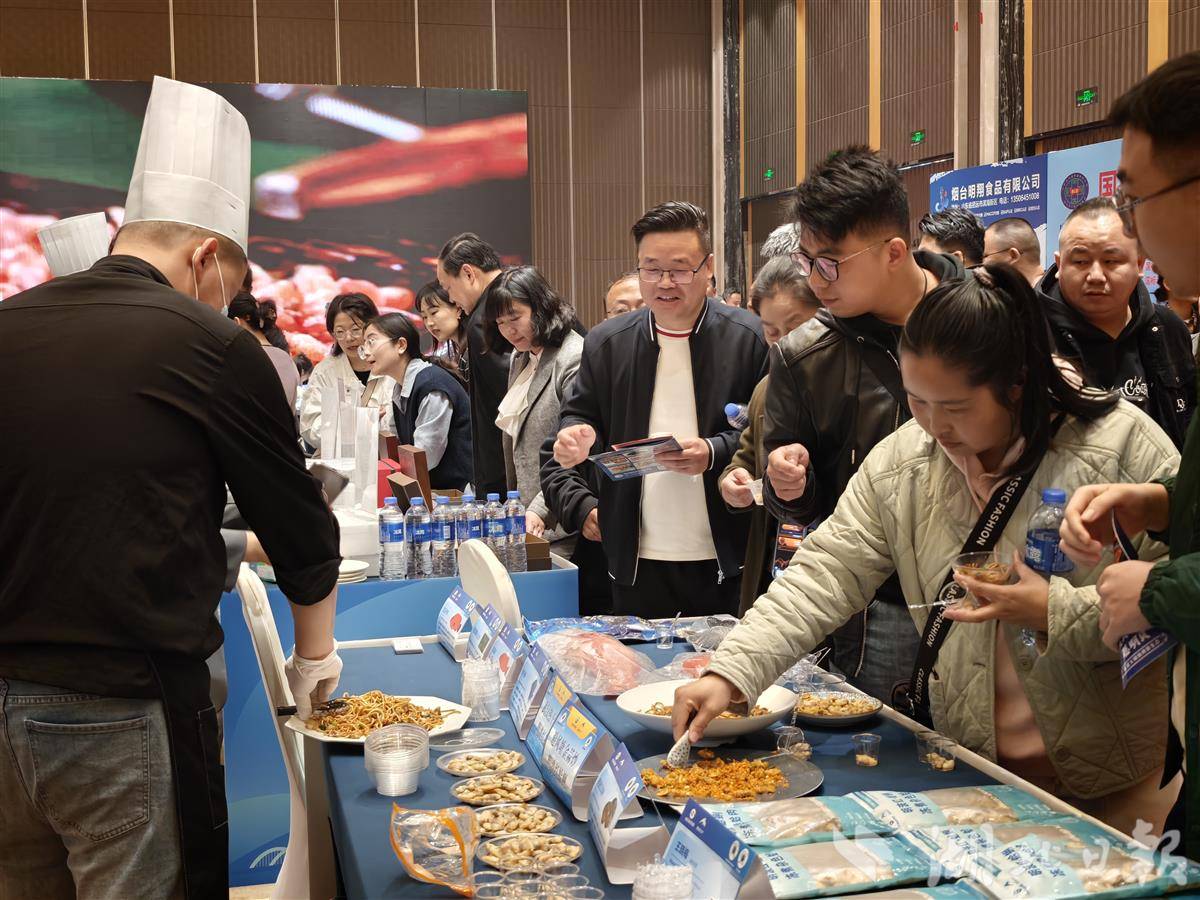 参会嘉宾试吃烟台海鲜食品。(湖北日报全媒记者杨然摄)