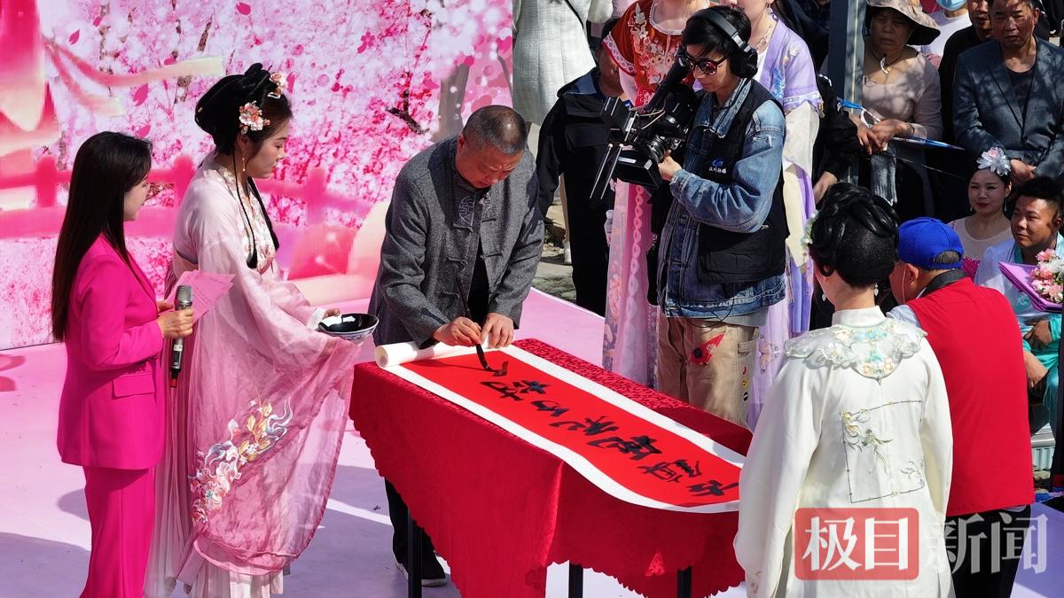 开幕式上,龙狮献瑞跃桃林,将桃花枝插向祈福树,拉开春日序幕;《垌塚镇歌》情景歌舞、《桃花谣》婉转上演,让地方农耕文化随桃花芬芳漫扬;桃源雅集更成亮点,古筝声里,国画桃花、隶书对联创作与非遗剪纸、草编、糖画技艺展示同台亮相,传统美学与春日盛景撞出别样火花,让游客在花海中触摸文化温度。最具人气的“桃花签对对碰”环节,让单身青年手持“子母桃花卡”现场结缘,灼灼桃花化作美好姻缘的见证,桃花伴手礼承载着满满的祝福。当印有“垌塚桃花季”的粉色气球漫天飞舞,粉色烟雾萦绕桃林,《明天会更好》的歌声响彻花海,这场春日盛会迎来最美高潮,田野为幕,桃花为媒,每一个身处其中的人,都成为这场浪漫的主角。