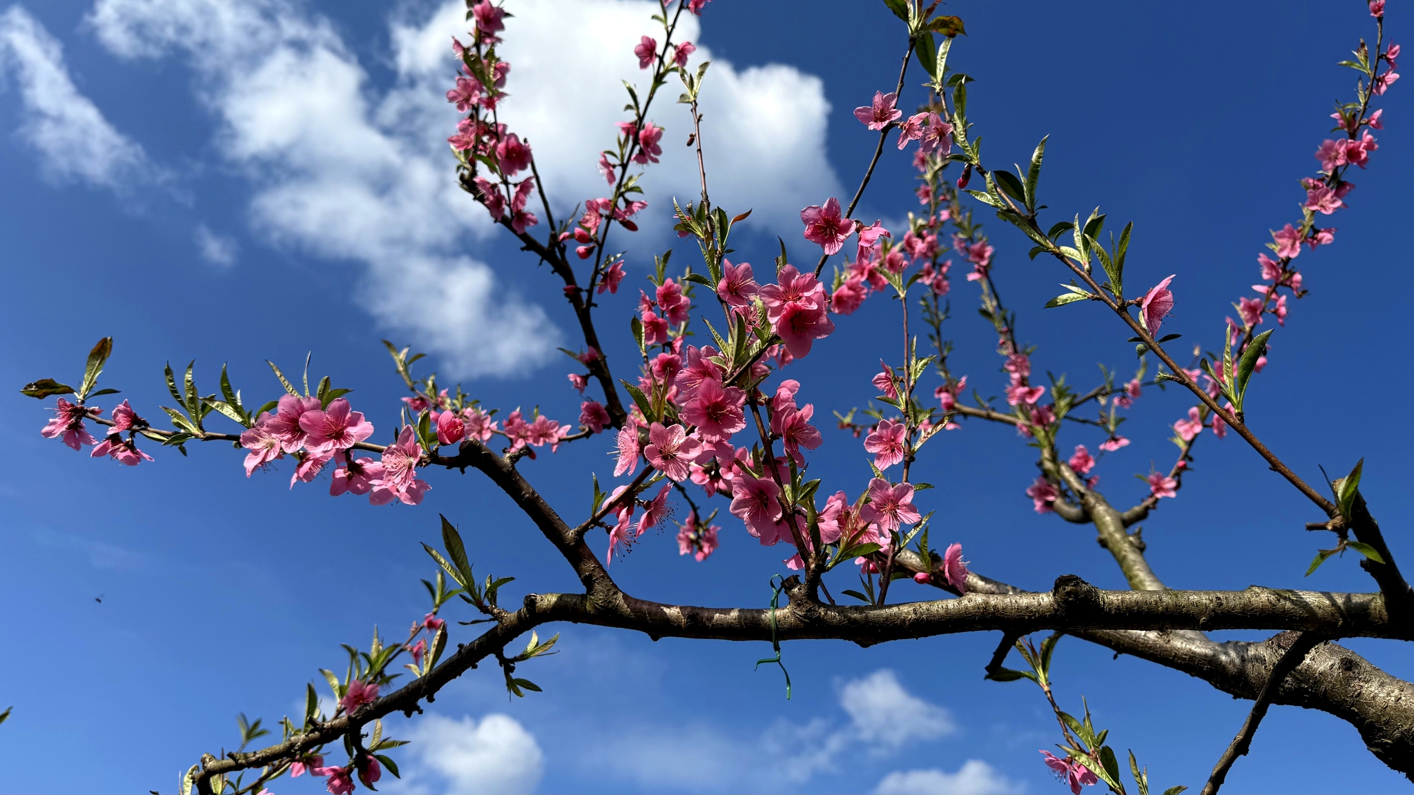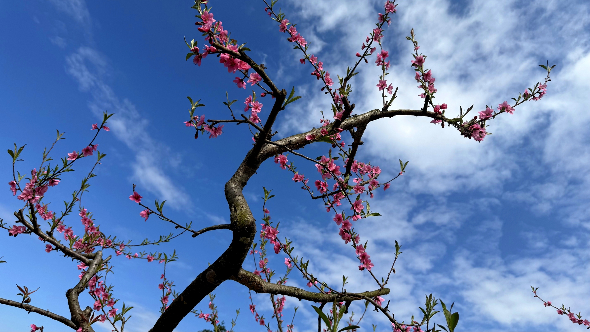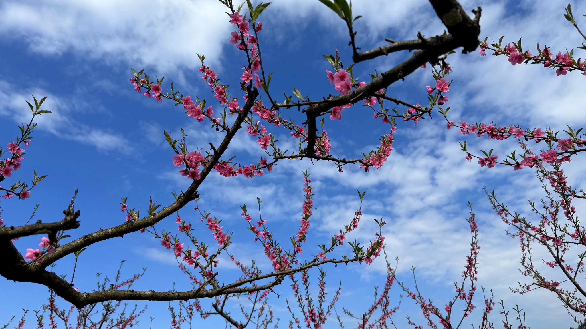 乌桃花的红与蓝天的蓝撞在一起,竟成了世间最动人的色彩。花影映着蓝天,蓝天拥着花影。每一朵向上的花苞,都是对春光的奔赴,对蓝天的向往。