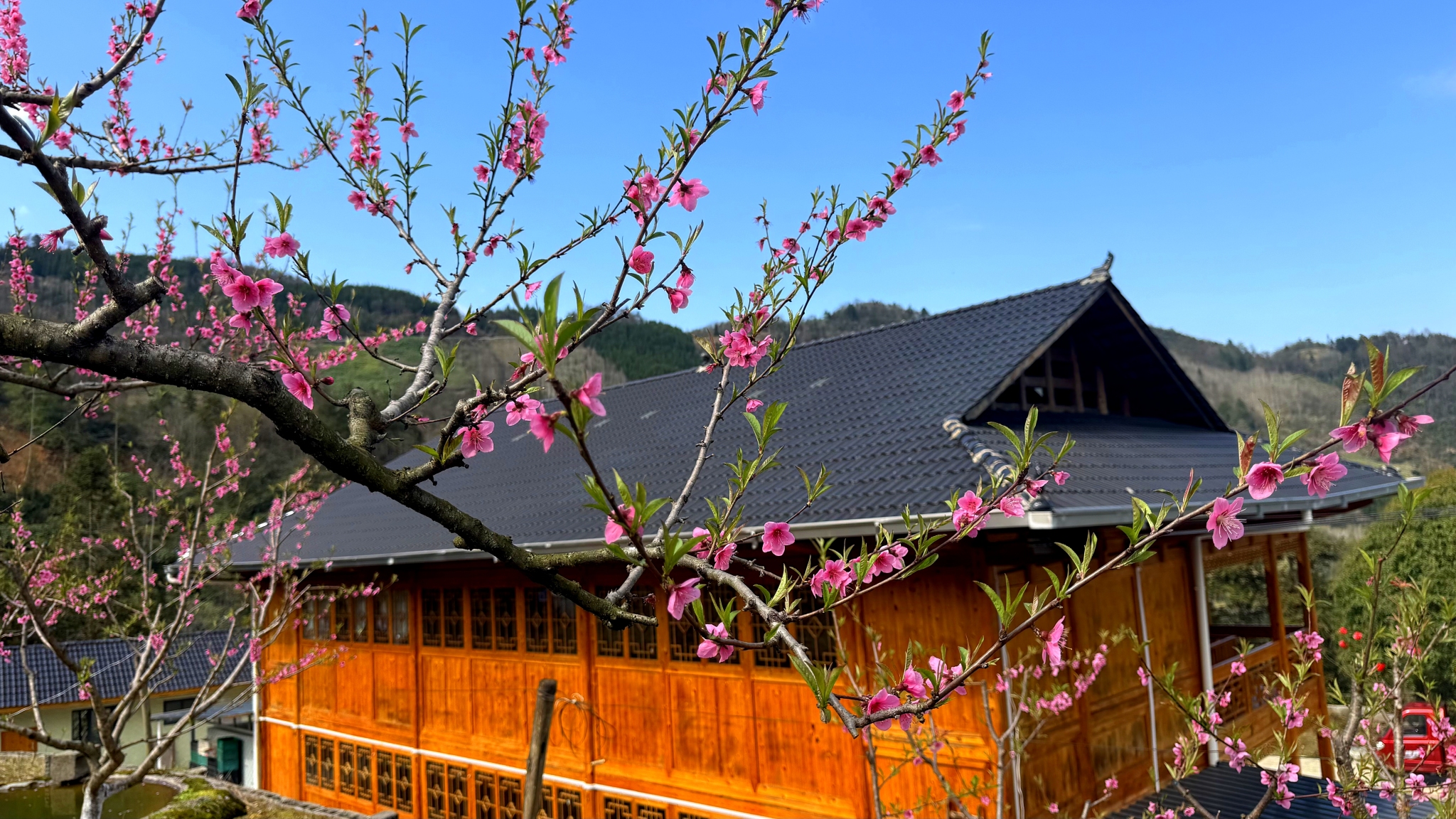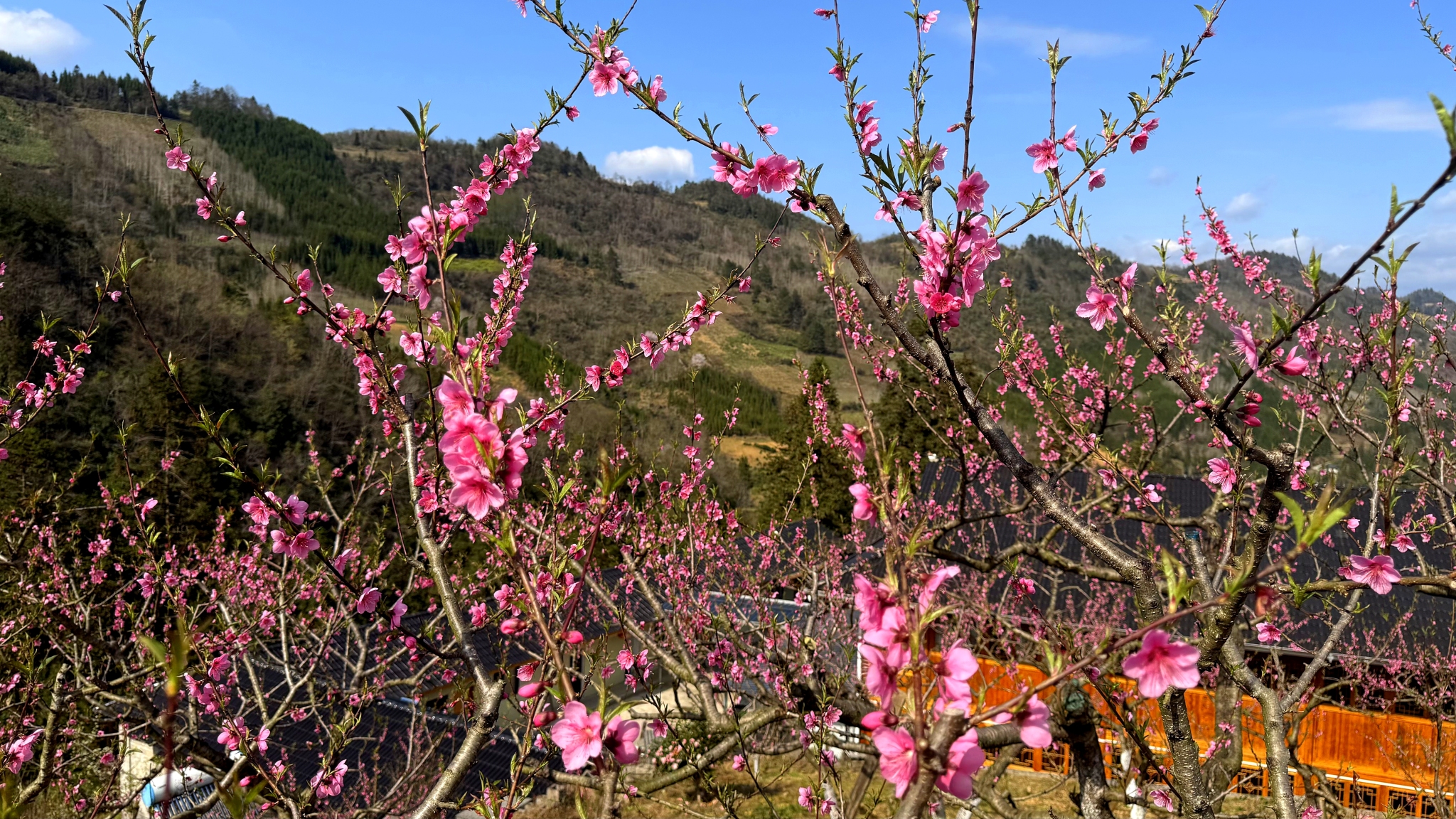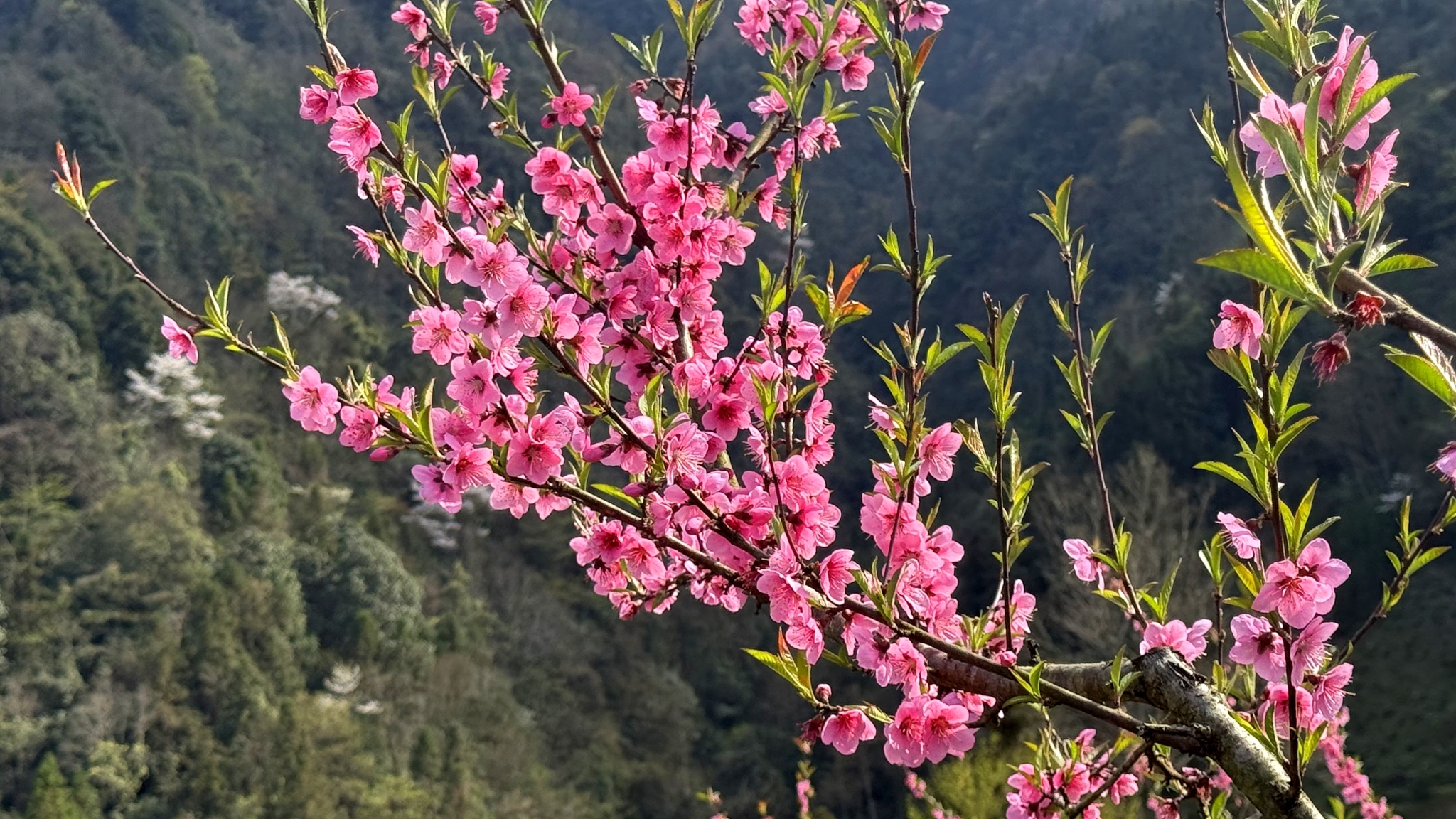 驱车行至鹤峰县太平镇芦坪村一组,远远便望见一片胭脂红云,那是乌桃的花,开得正盛。疏枝横斜,不似寻常桃花的娇柔,倒有几分红梅的风骨,一枝枝伸向蓝天。