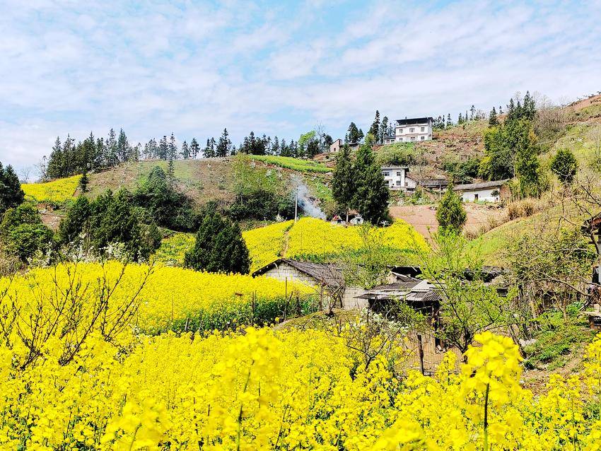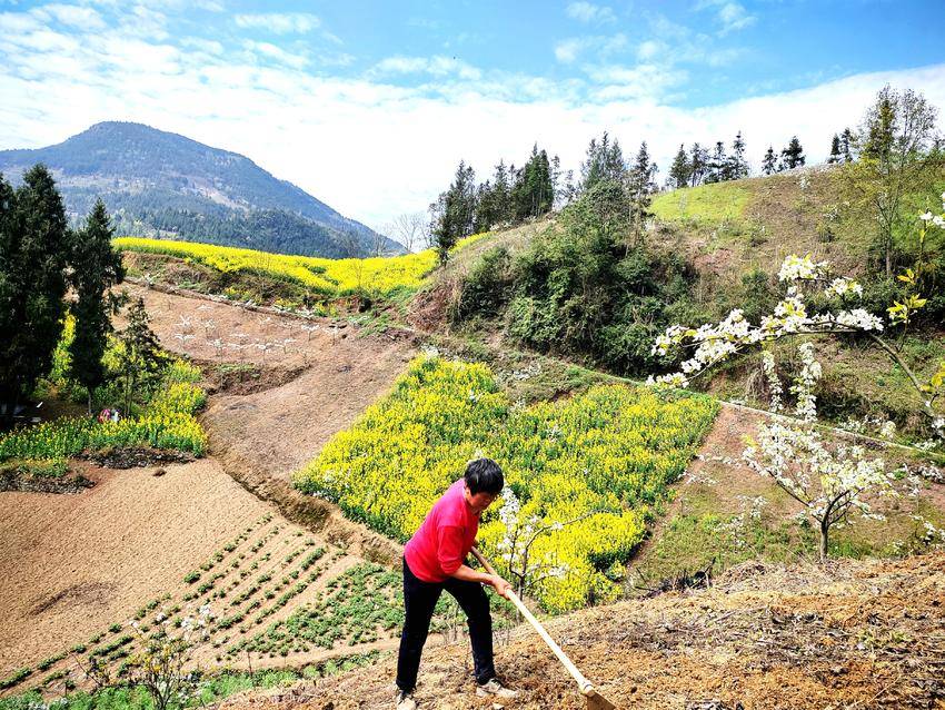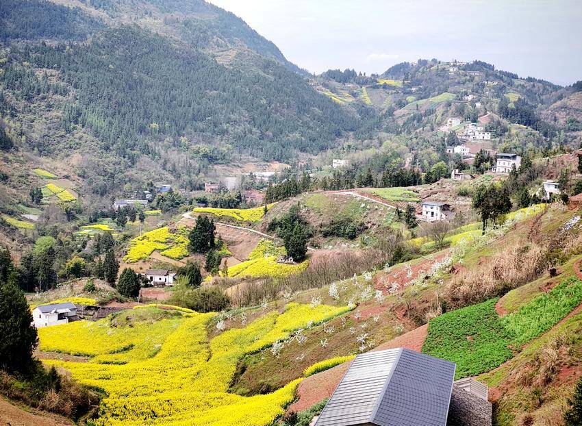站在巫峡口村的山岗上极目远眺,层层叠叠的梯田里,金黄的油菜花如浪涛般铺展起伏,与洁白如雪的梨花交相辉映,点缀在青黛色的群山之间。蓝天白云下,白墙黛瓦的民居错落有致,炊烟袅袅升起,与漫山遍野的繁花相映成趣,勾勒出峡江地区独有的田园诗意。