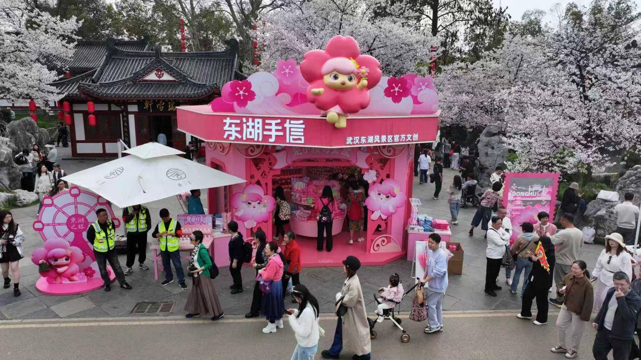 人潮涌动也带火了周边文旅消费。樱花树下,东湖手信文创快闪店热闹非常。“从早上开张到晚上九十点,我们连喝口水都得小跑着来,吃午饭都是轮着扒两口——人太多了,根本走不开。”工作人员刘媛媛感叹。据介绍,近期,赏樱季新品“楚小樱”系列产品销售环比增长约20%,线上线下客流持续攀升。一款樱花挂件一天就能卖出上千件,“顾客经常一拿就是三四个,说是要带回去送给同事朋友”。