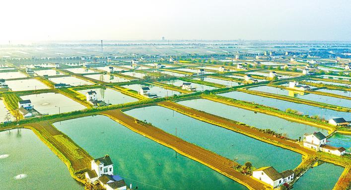 3月25日,雨后初晴,晨光铺洒长江岸线,枝江金湖边万亩鱼塘碧波如镜,美如诗画。 (湖北日报全媒记者 刘曙松 摄)