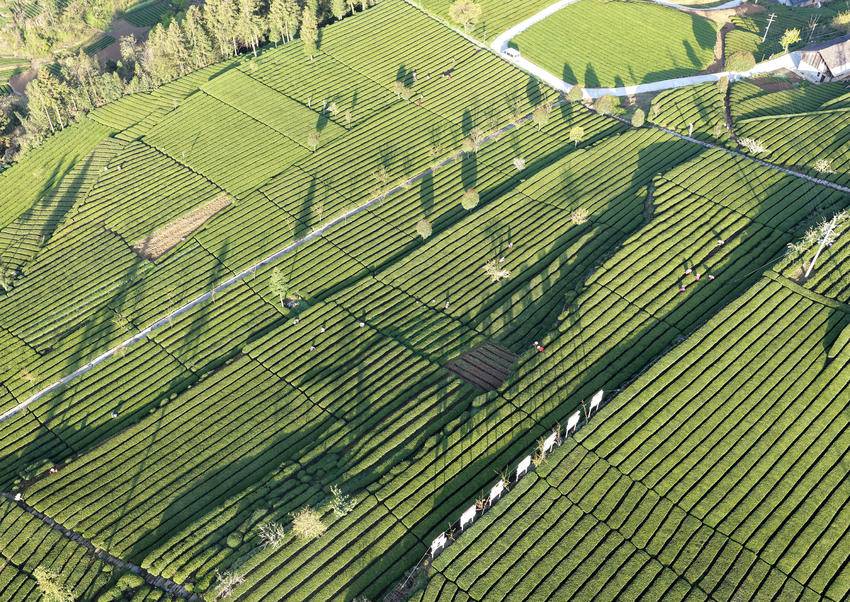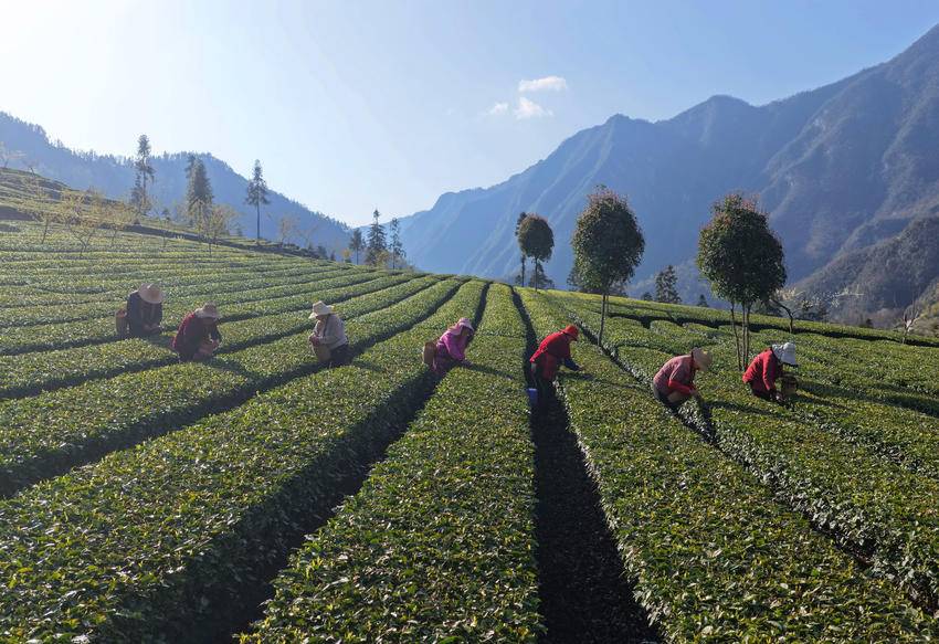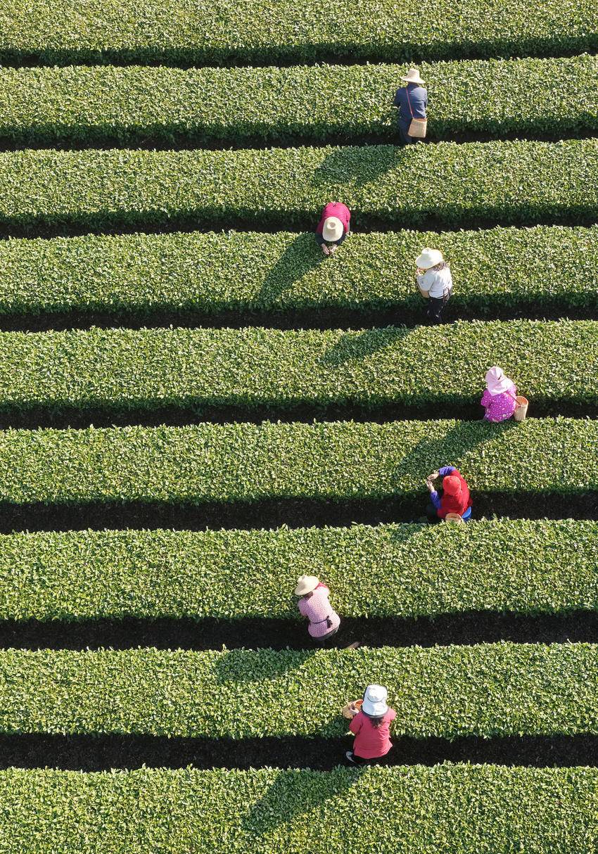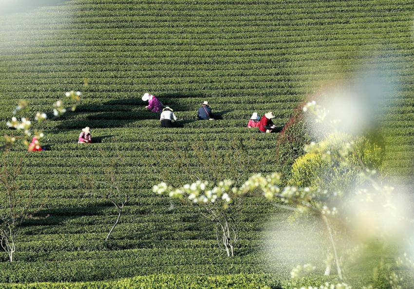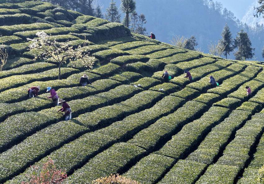 4月1日,茶农在湖北省秭归县九畹溪镇峡口村丝绵茶基地采摘茶叶嫩芽。