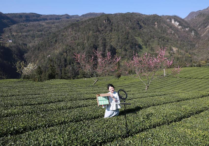 4月1日,青年茶农龚颖年在湖北省秭归县九畹溪镇峡口村茶山直播带货丝绵茶。