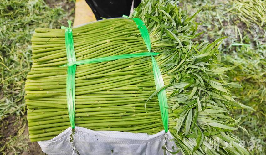 走进基地,成片的藜蒿长势喜人,茎秆翠绿鲜嫩。数十名工人分工明确、动作娴熟,收割、切根、去叶、打包,有条不紊。据基地负责人介绍,这片藜蒿基地亩产可达2000斤,优质的水源和土壤条件使得藜蒿口感脆嫩、品质上乘,整体产量稳定、销路畅通。