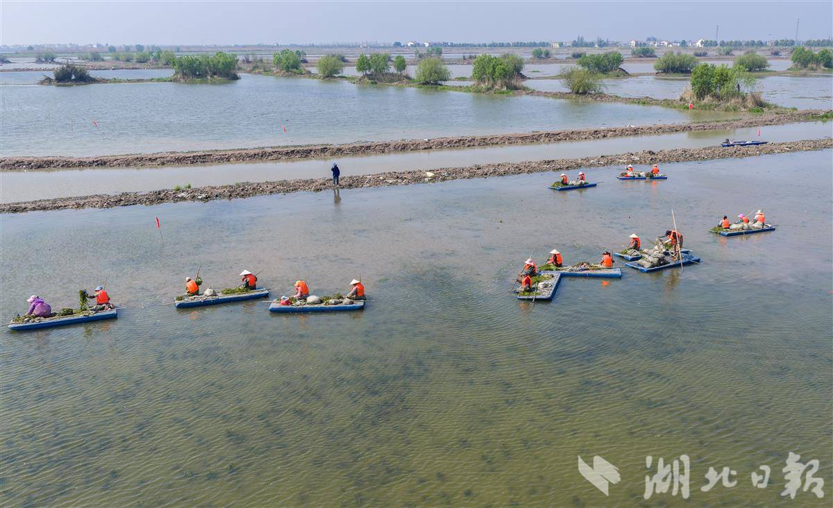 4月1日,洪湖入湖口生态修复项目(一期)现场,水面清澈,阳光直透水底,水下植物摇曳可见,工人们正在船上栽种沉水植物苦草。 该项目是洪湖治理“活水、净水、复绿”的关键一环。眼下,工人正抢抓春季施工窗口期,在4350亩生态湿地里分区种下芦苇、苦草等本土水生植物,形成从岸边到深水的完整植被带。项目建成后,不仅能有效拦截入湖污染物,还能为洪湖提供稳定的水生植物种源基地。目前洪湖水质稳定保持在Ⅳ水平,水生植被覆盖率提升至32.5%,生态稳步向好。(湖北日报全媒记者 薛婷 刘郸 通讯员 罗东平 摄)