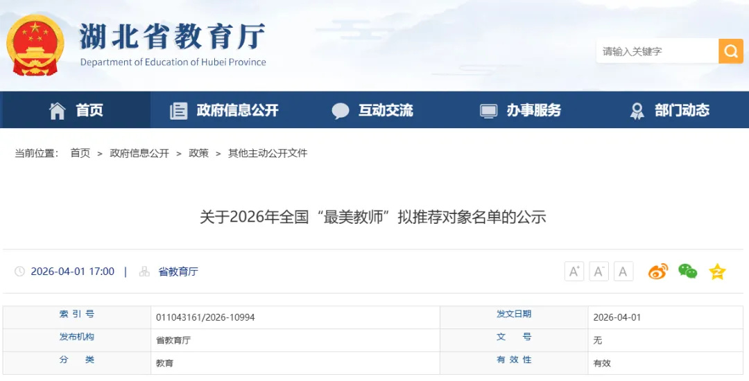 4月1日,湖北省教育厅发布《关于2026年全国“最美教师”拟推荐对象名单的公示》,全省仅3人上榜,十堰市竹溪县丰溪镇中心学校副校长黄春立入选。