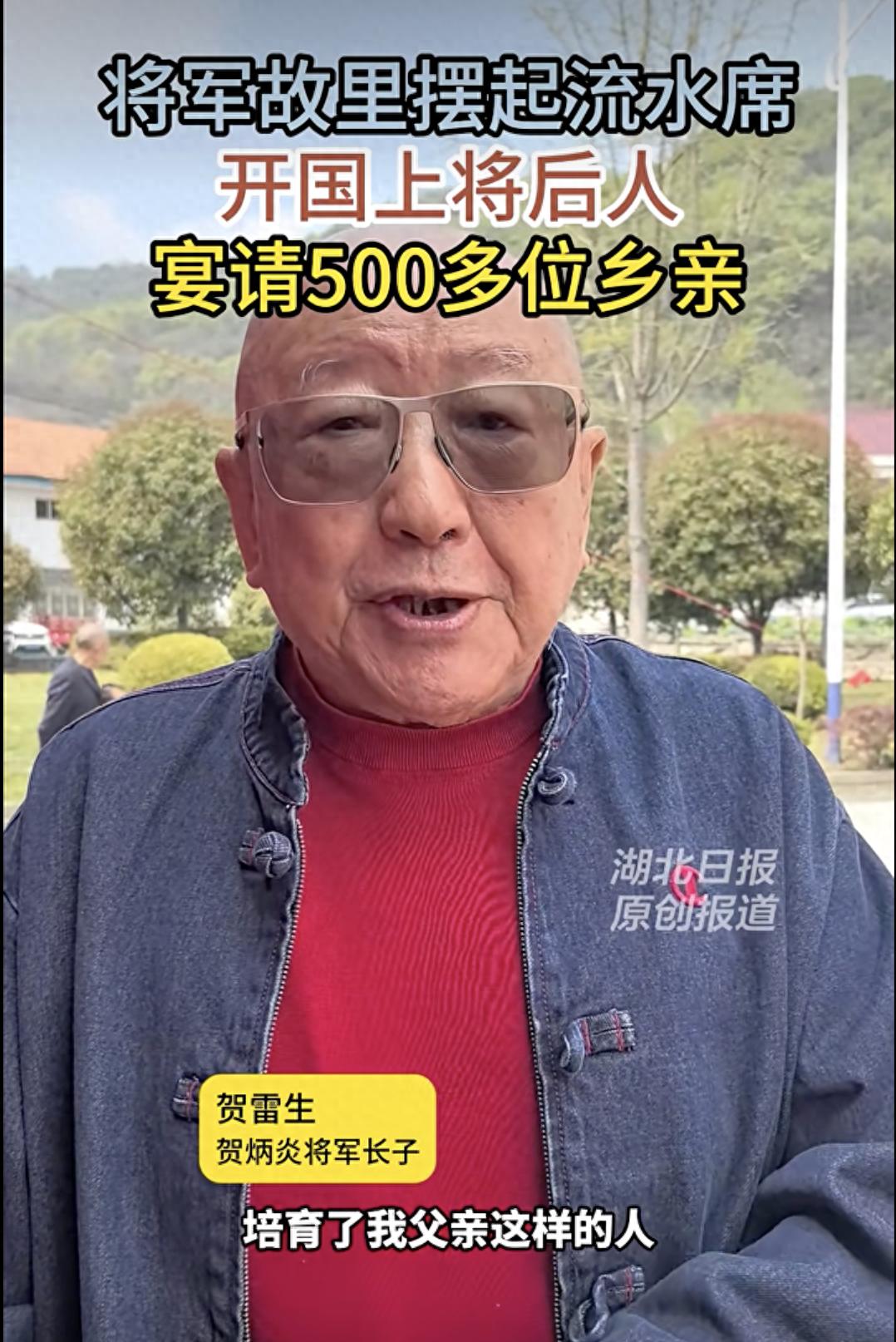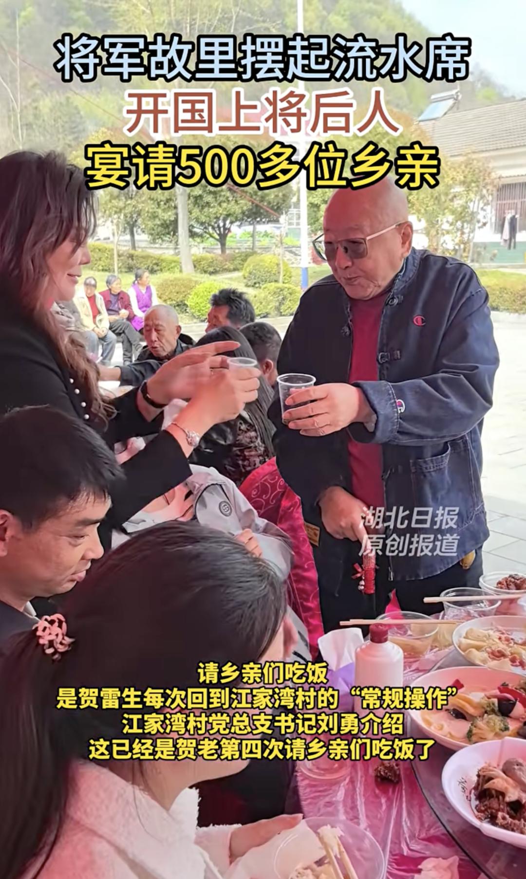 据湖北日报报道,3月31日,宜都市松木坪镇江家湾村的小广场上热闹非凡。开国上将、独臂将军贺炳炎的长子贺雷生在这里摆起流水席,宴请500多名村民。在当日拍摄的视频中,当地村民围坐,村民竖起大拇指,为贺雷生的做法点赞。