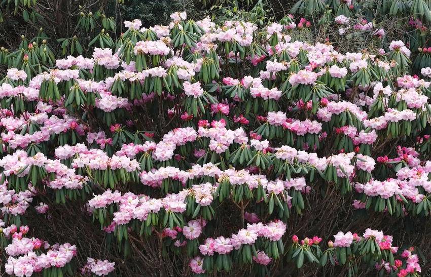 保康云锦杜鹃是中国特有珍稀常绿灌木或小乔木,偏好温凉湿润、半阴的生长环境。它的植株高大苍劲,树龄跨度久远,树冠浑圆舒展,叶片形似枇杷叶,显得格外雅致;花朵簇拥着绽放在枝头顶端,花型硕大饱满,花冠呈漏斗状、钟形,花团锦簇、色泽艳丽,兼具极高的生态保护、景观观赏和科研价值,素有“苍干如松柏,花姿若牡丹”的美誉。