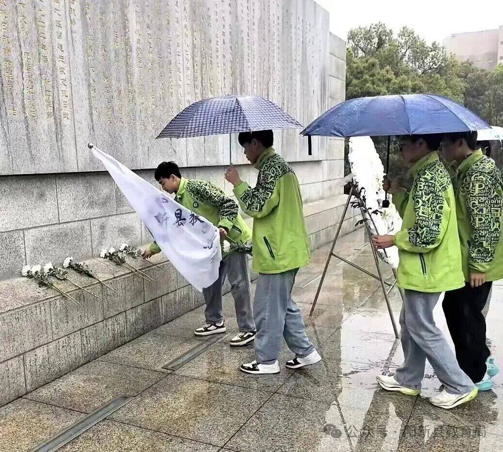 同一天,细雨蒙蒙,荻田初级中学师生走进烈士陵园,开展清明祭扫活动。师生们整齐肃立,追忆革命先烈的英勇事迹,在缅怀中汲取奋进力量。校长王芳军深情寄语,勉励全体师生赓续红色血脉,勇担时代使命。仪式结束后,师生们手持小白菊,依次绕行纪念碑,敬献鲜花,以朴素庄重的方式表达对先烈的深切怀念。