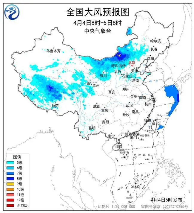 中央气象台4月4日06时继续发布大风蓝色预警:预计4月4日08时至5日08时,内蒙古中西部、宁夏大部、山西北部、京津冀北部和南部、山东北部、新疆南部、青海中东部、西藏中西部、川西高原北部等地部分地区有5~7级风,阵风7~9级;其中,内蒙古中部局地阵风10级以上。东海东部海域、台湾以东洋面将有7~8级风、阵风9级。