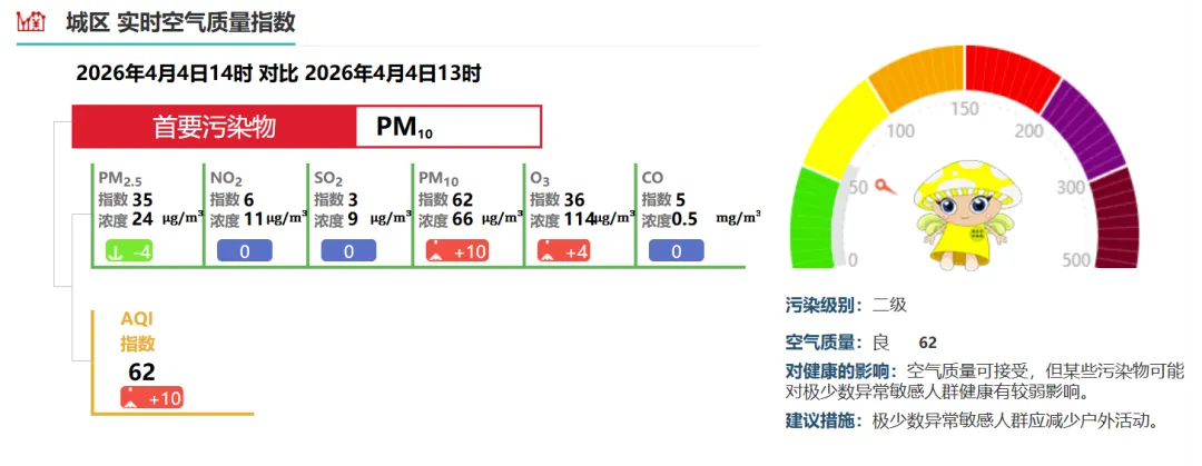 4月6日,武汉市为多云到阴天,偏北风3级、阵风4到5级,大气扩散条件一般。预计6日空气质量指数为80—110.良到轻度污染,首要污染物为PM10.