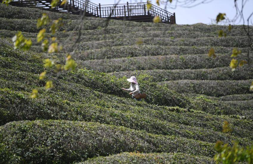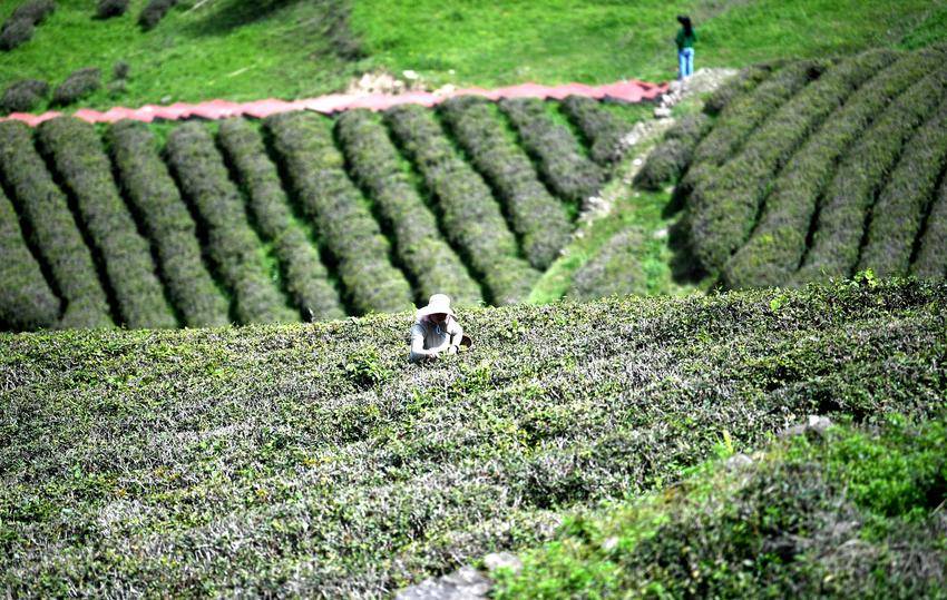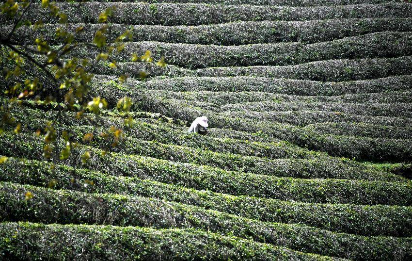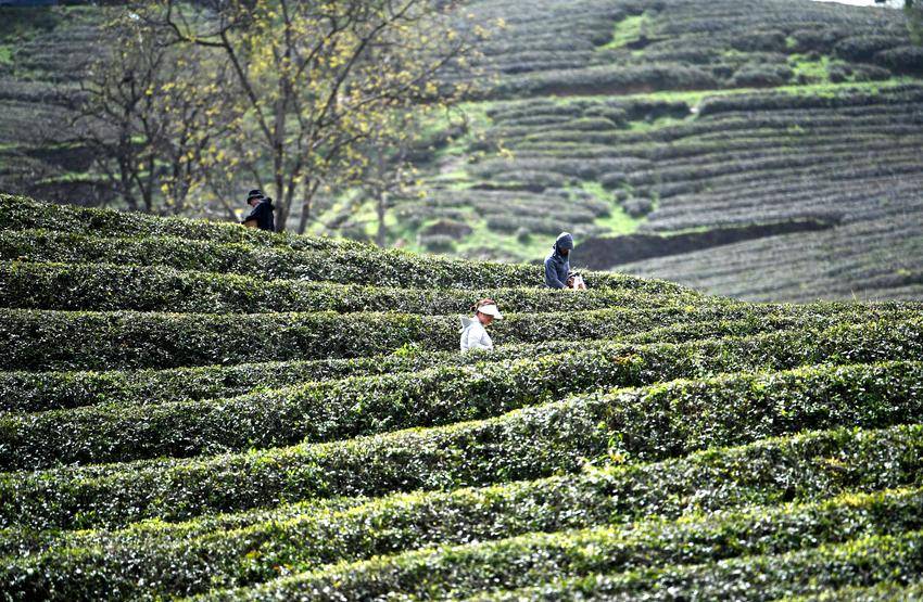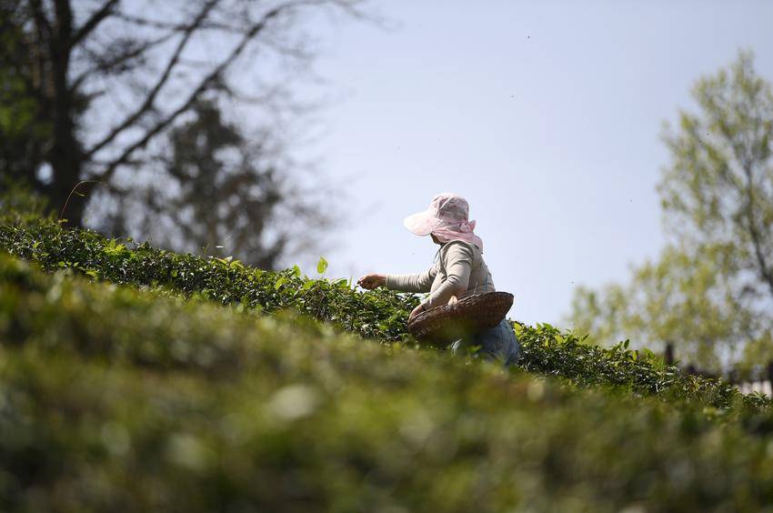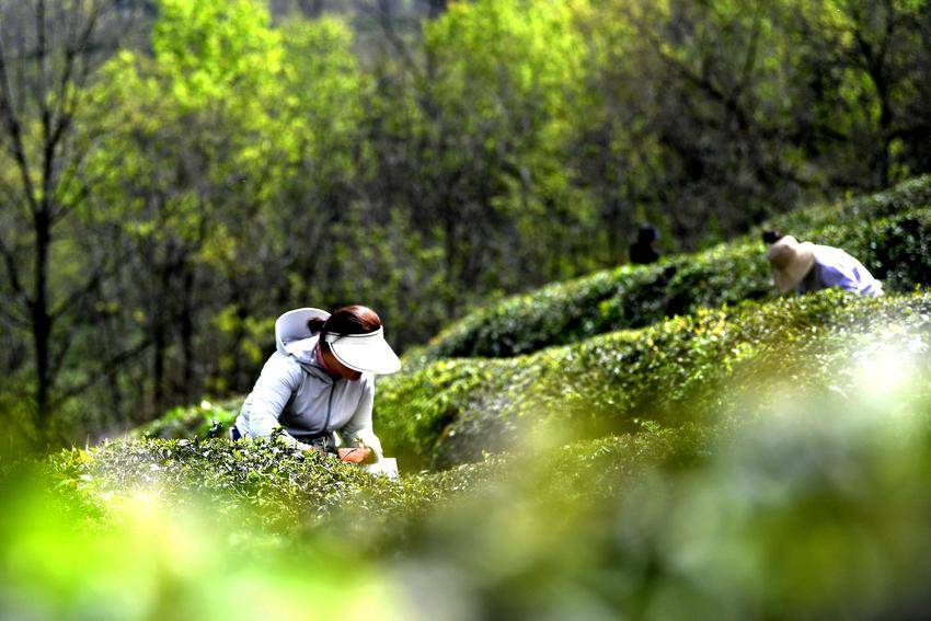 ▲▼4月4日,茶农在保康县官山茶园采摘明前茶。