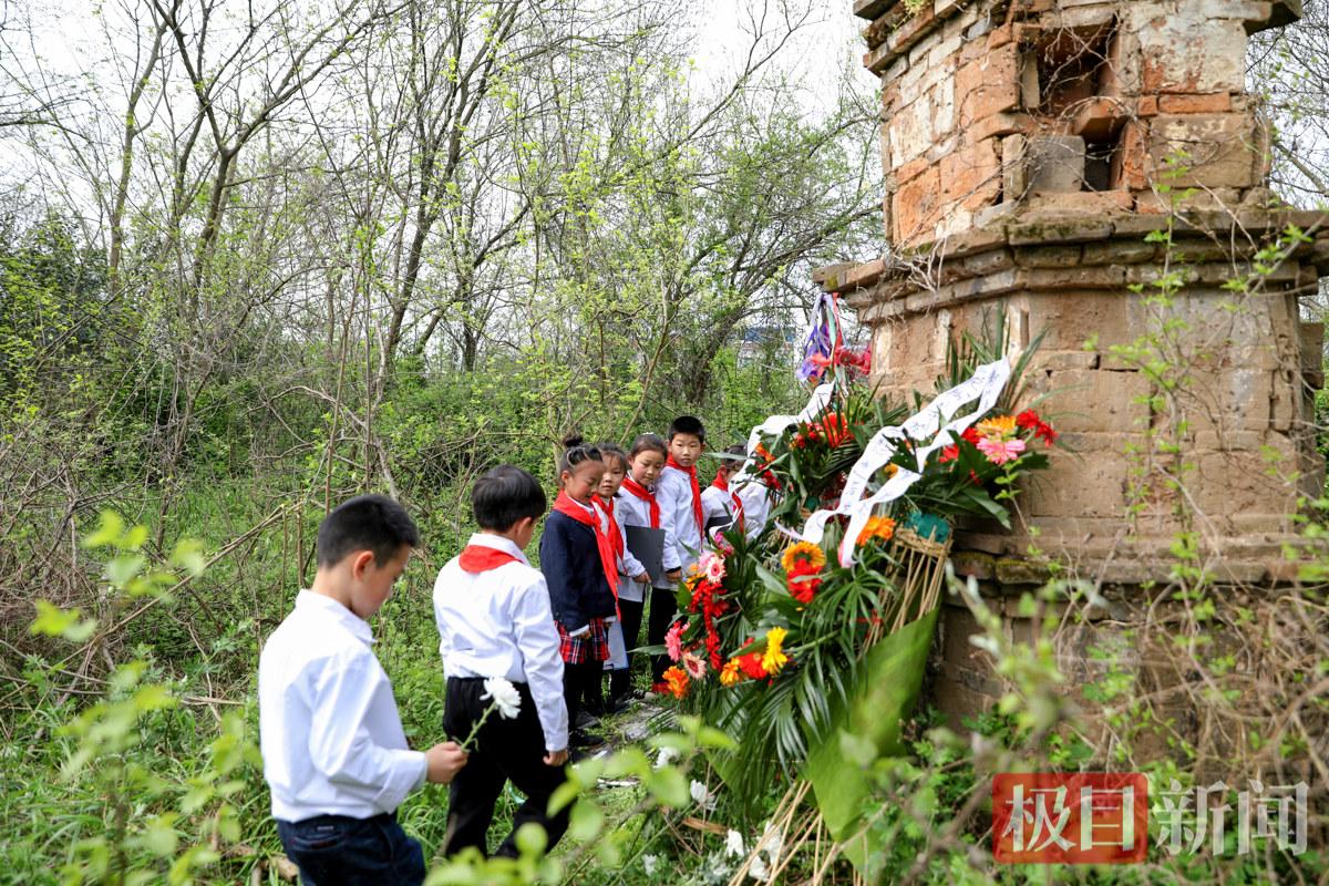 2019年3月31日,当地学生来到位于湖北监利福田寺镇柳关村的“摆骨亭”,向长眠在此的红军无名烈士献花。这座放置红军烈士遗骨的六角形砖亭,是当地村民在1956年自发出资修建。(监利市融媒体中心 徐美平 摄)