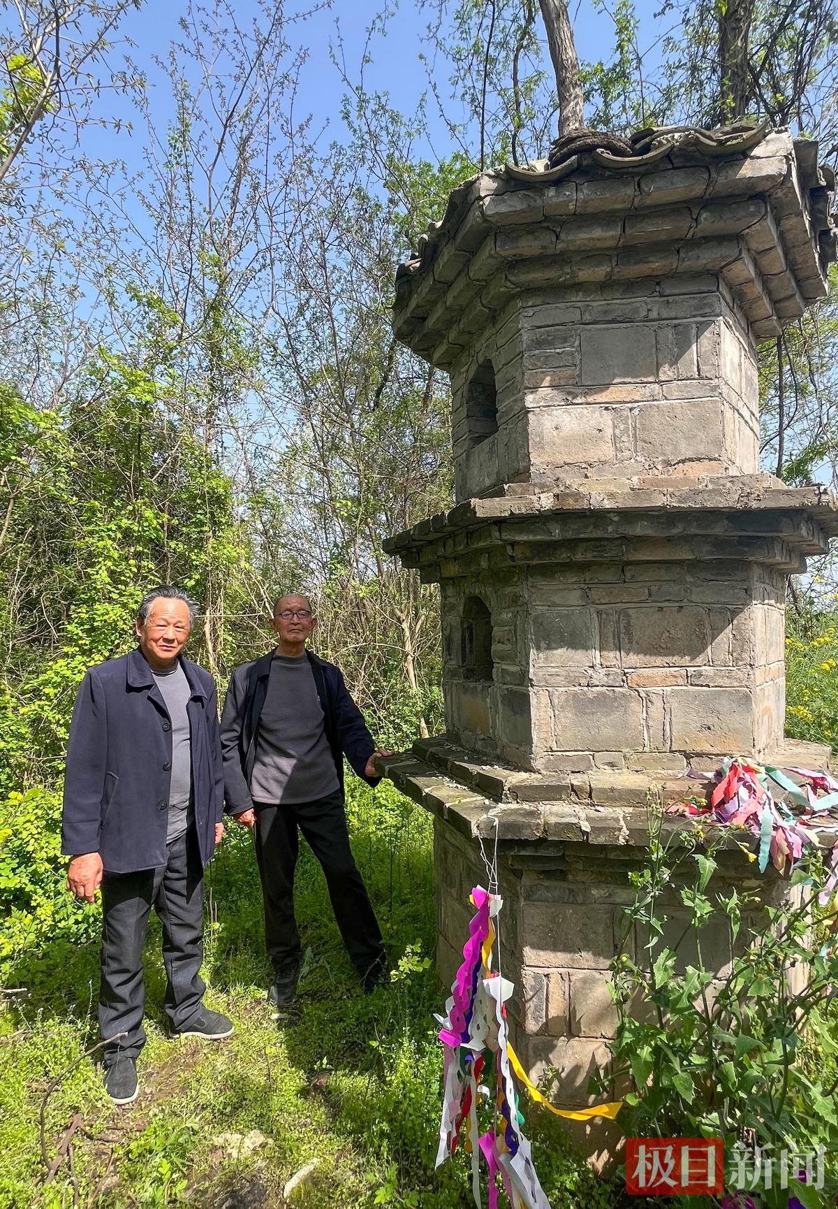 4月4日,湖北省监利市福田寺镇内荆河畔,复修后的“摆骨亭”旁,当地文史研究者杜好荣(左)和柳杨硕在祭奠英烈。(极目新闻记者 黄志刚 摄)
