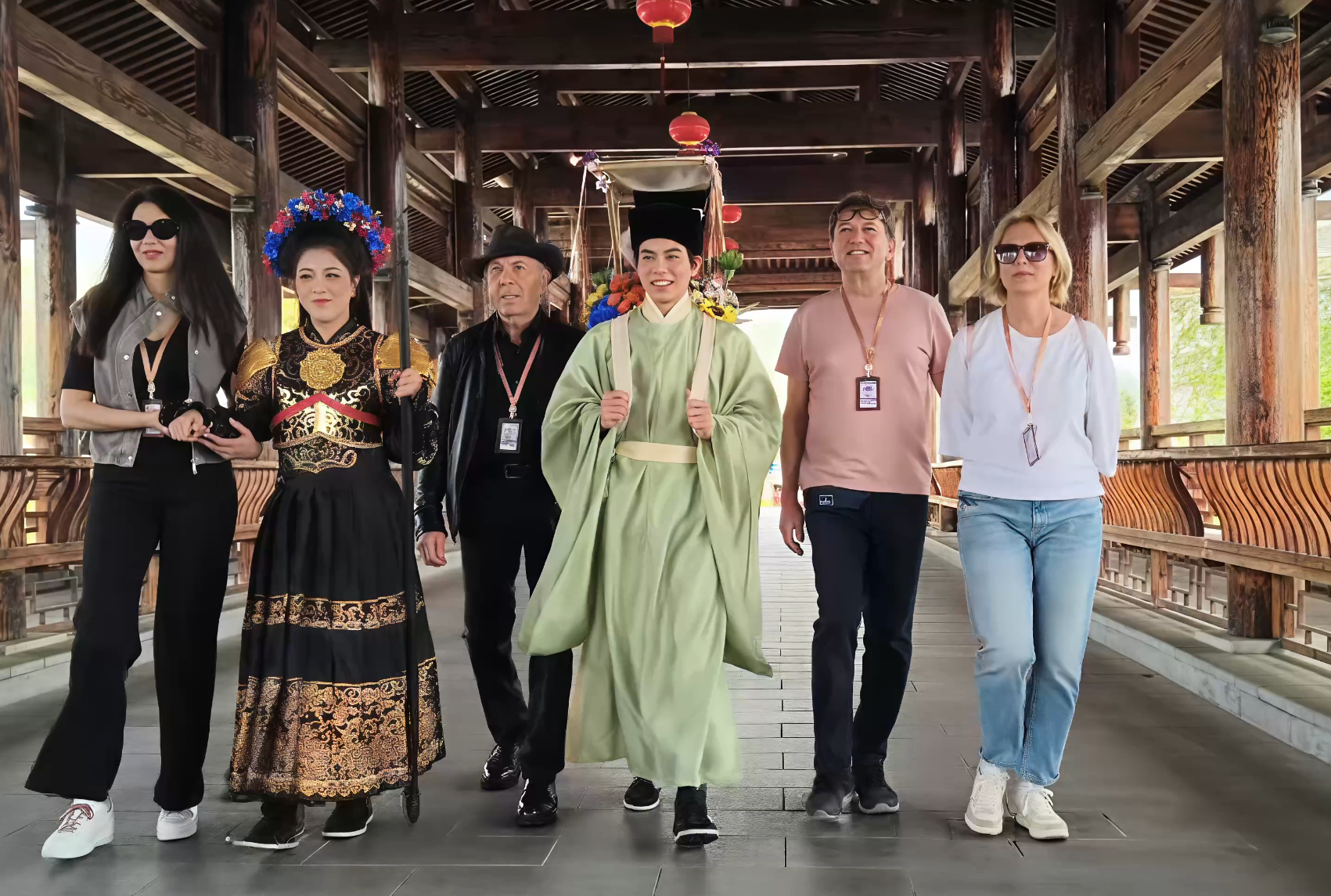 一位德国游客伸出手,扶着“将军”的手臂,邀她一起同游,“花神”们欣然允许,带着外国游客们在古风长廊里漫步穿行。这群外国游客本是为三峡大坝而来,却在天问公园里近距离触摸到中国传统节日的温度与韵味。