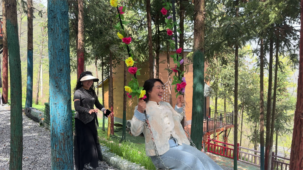 走进伴山观云民宿,现场满是闲适的休闲氛围。林荫下,游客们三五成群围坐轻声闲谈,有的驻足合影留念,有的迎着微风悠闲荡着秋千;另一旁,不少游客动手准备烧烤食材、围炉烤制美食,烟火气息与欢声笑语交织,处处洋溢着惬意的乡村休闲氛围。