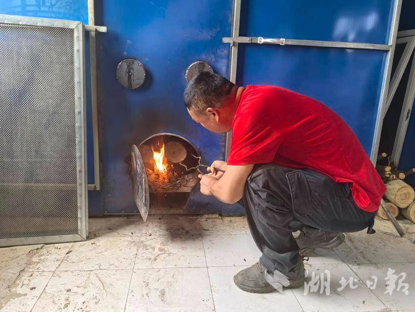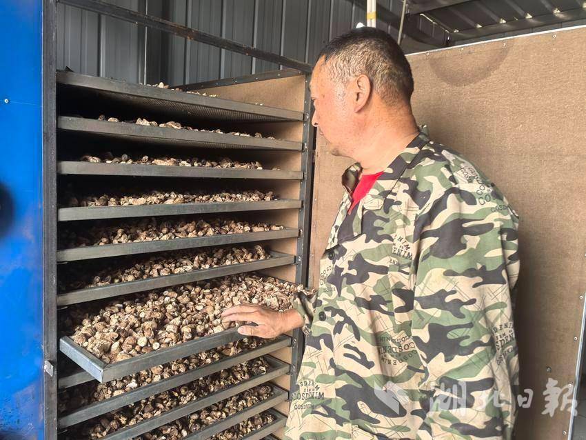 大塘村气候温润,空气湿度也常年维持在香菇生长适宜的区间,种出来的香菇香味浓郁、肉厚有弹性,在市场上很受客商欢迎。鲜菇不易储存,基地将烘干间搬到大棚旁边,采摘烘干装袋可一步到位,也在最大程度保留了鲜香口感。刚添完柴的负责人彭兵刚接着把香菇分拣摆放到烘干架上,经他介绍,这一季春菇品质好,不仅是气温适宜的原因,还与品种选得准息息相关。
