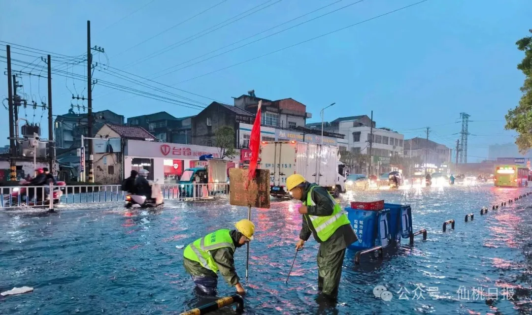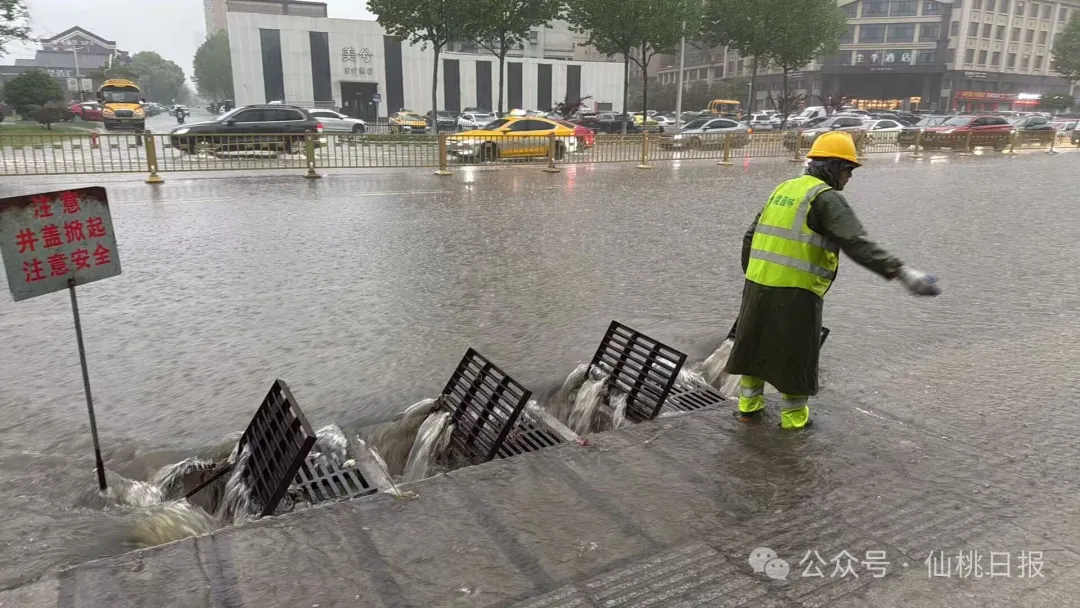 在大新路以西片区,片区调度组顶着暴雨巡查大洪路、仙桃大道疾控中心路口、丝宝路等易积水点位,值守人员撬开井盖、清理落水筛堵塞物;在大新路以东片区,片区调度组紧盯何李路青青家园、叶王路十字路口、新城大道气象局等关键节点,值守人员“两人一岗、三人一段”,专人看护每一个开启的井盖。