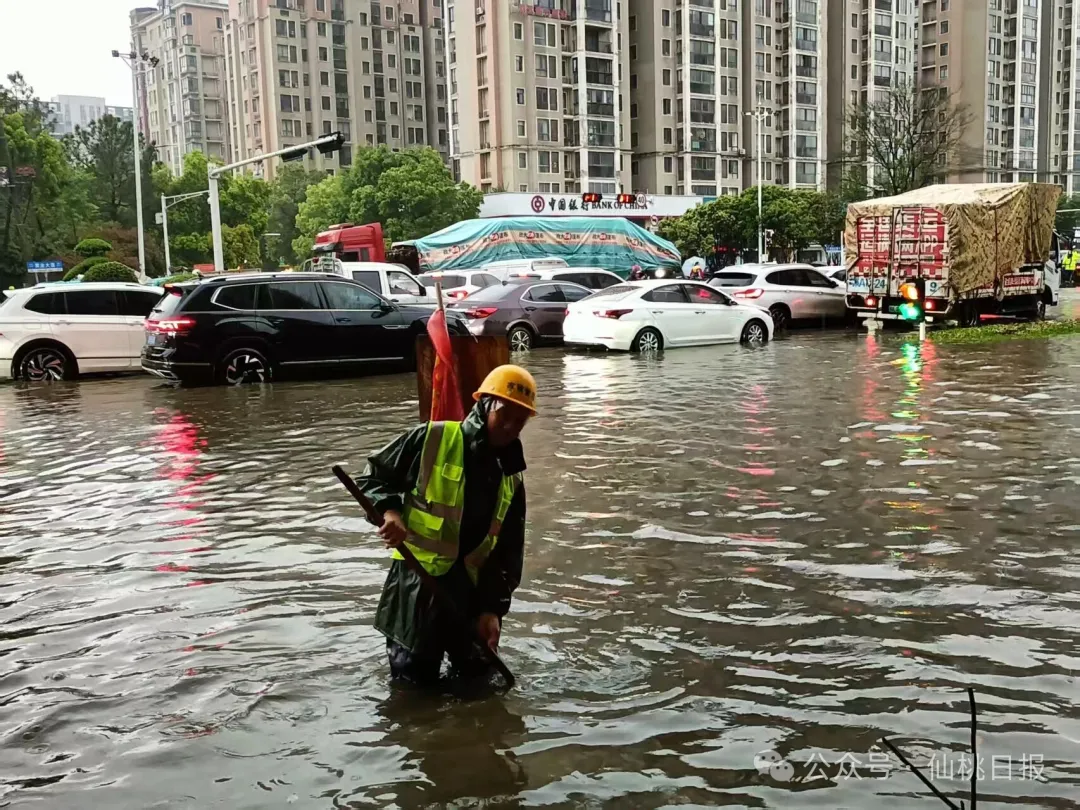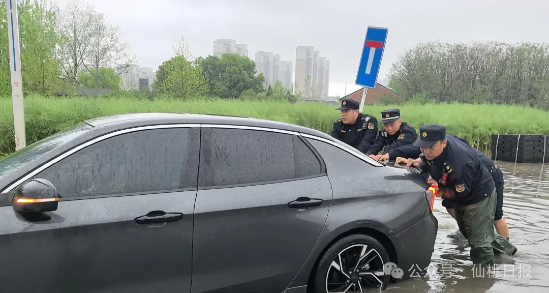 上午9时许,沙嘴街道、新城一号路口、仙桃大道等路段因短时强降雨出现严重积水,十多辆轿车涉水后熄火被困,车身大半浸泡在浑浊积水中,车主进退两难。城管执法队员第一时间赶赴现场,不顾雨水浸透衣衫、积水没过脚踝,合力将被困车辆推至安全区域,及时消除了道路通行隐患,保障了过往车辆安全。