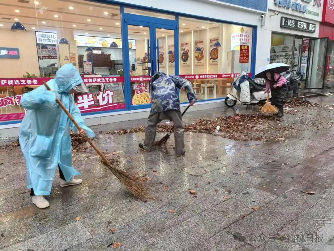 凌晨4点,天未破晓、雨势正酣。环卫城西片片长张启访已带领十余名环卫工人奔赴城区主次干道。他们头戴斗笠、身披雨衣、脚蹬胶鞋,在齐踝深的积水中逐段排查。面对被落叶、杂物堵塞的落水口,队员们徒手扒开堵塞物、清扫路面积水,争分夺秒为早高峰市民开辟“安全通行路”。