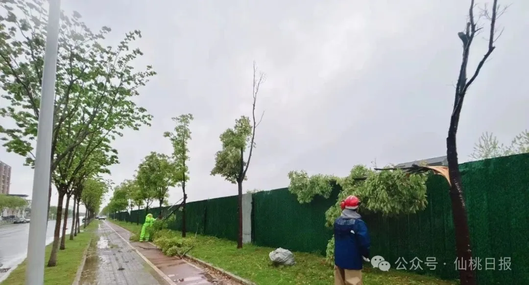市林业事业发展中心辖仙怡养护公司和公园管理处迅速启动应急预案,由23人组成的应急小分队分5组带领416人的网格人员进行巡查排险排涝,现已扶正倒树61棵,清理断枝36车次,15台潜水泵进行排涝,确保行人安全和道路畅通及苗木损失降到最低值。
