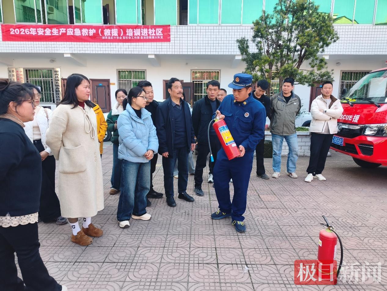“先拔掉保险销,握住喷管,对准火焰根部,压下手柄——灭!”在郧西县城关镇一社区广场上,消防指战员话音刚落,一位居民干脆利落地将一盆燃烧的油火扑灭,围观人群发出阵阵叫好声。