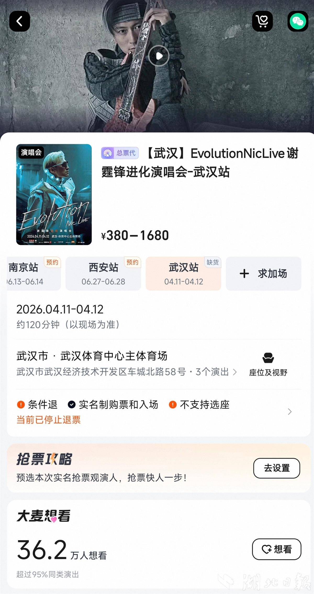 据武汉交警发布的信息,预计每日有3万余名持票观众到场观演。门票价格分为看台380元、580元、780元、980元,内场1380元、1690元等多个档位,早在开演前就已售罄。某票务平台显示,超过36万名网友标记“想看”。