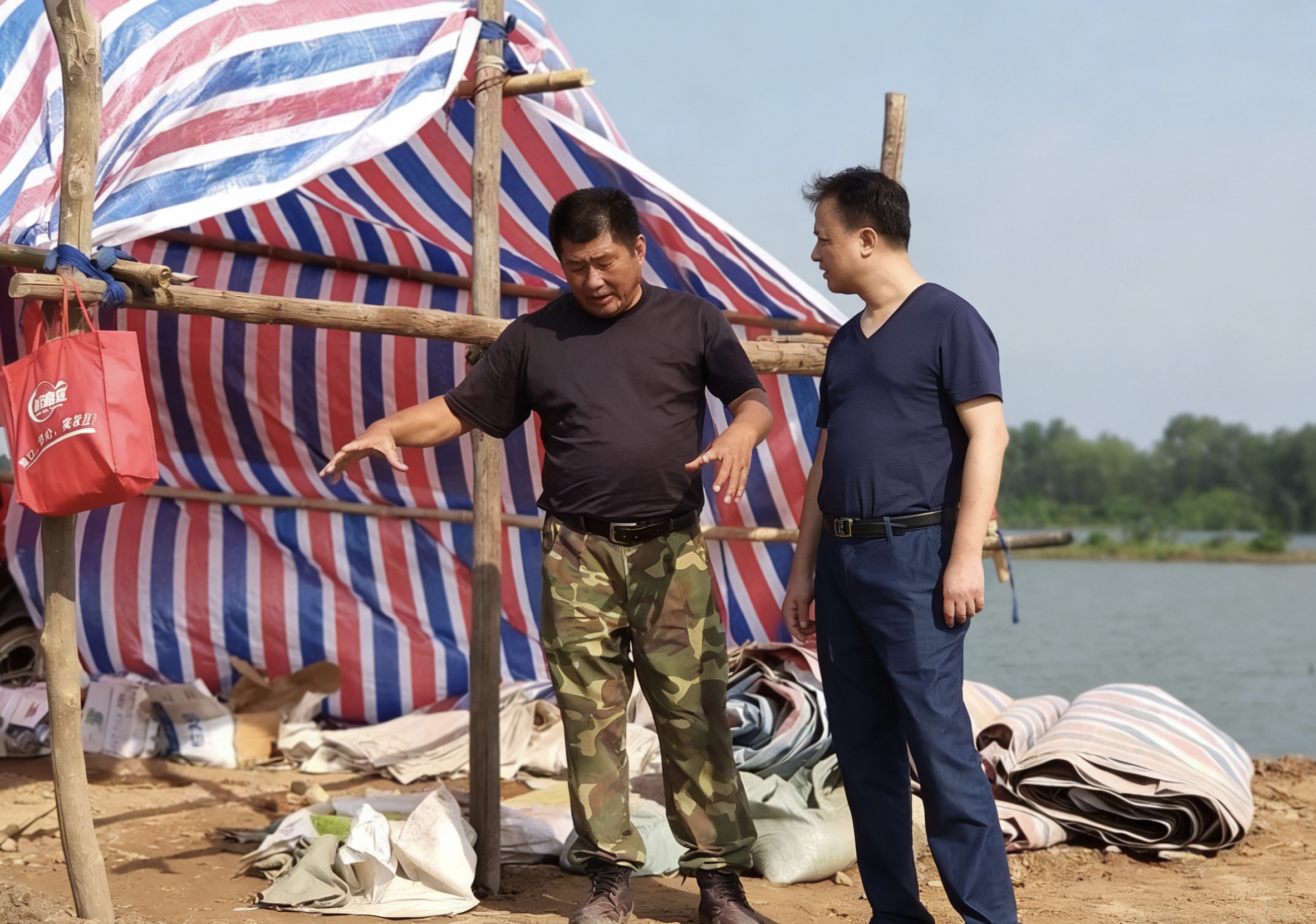 2020年防汛,他连续40天吃住在堤上,肾结石发作,疼得面色惨白,妻子朱莉连夜送药,他服药喝水、捶腰强忍,转身又扎进险段。