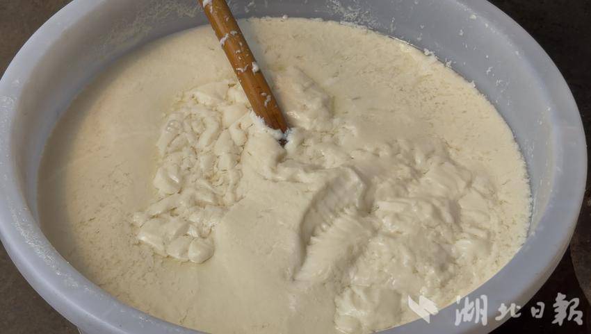 随后,李女士将鲜豆浆倒入锅中用文火慢慢熬煮,待煮好的豆浆晾至适宜温度,加入石膏轻轻点制,原本流动的豆浆渐渐凝结成鲜嫩的豆花,她用勺子舀起一勺,豆花白嫩如雪,轻轻一晃便微微抖动。