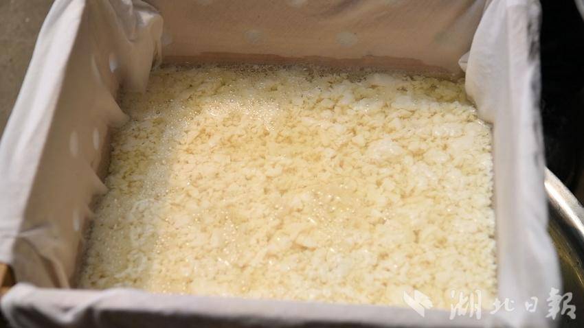最后,她把豆花一勺一勺舀进铺好纱布的木框里,用纱布包好,盖上压板,再压上一块洗净的青石。多余的水分顺着木槽滴滴答答流出来,时间在这一刻变得缓慢。大约两三个小时后,打开纱布,一块四四方方、质地紧实、切口细腻如脂的手工豆腐便做成了。