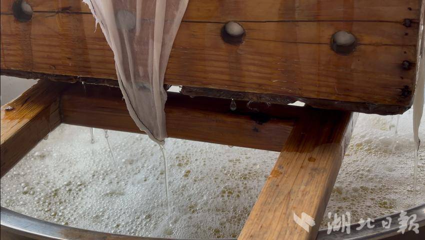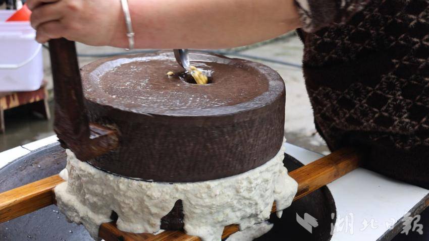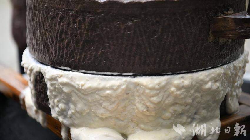 “做豆腐,急不得。”李女士说着,将浸泡了一整夜的黄豆连同山泉水一起,一勺一勺送进石磨。石磨“咕噜咕噜”转起来,乳白色的豆浆从磨缝里缓缓溢出,顺着磨槽汇成一股细流慢慢流淌,浓郁的豆香就这样渐渐弥漫开来。
