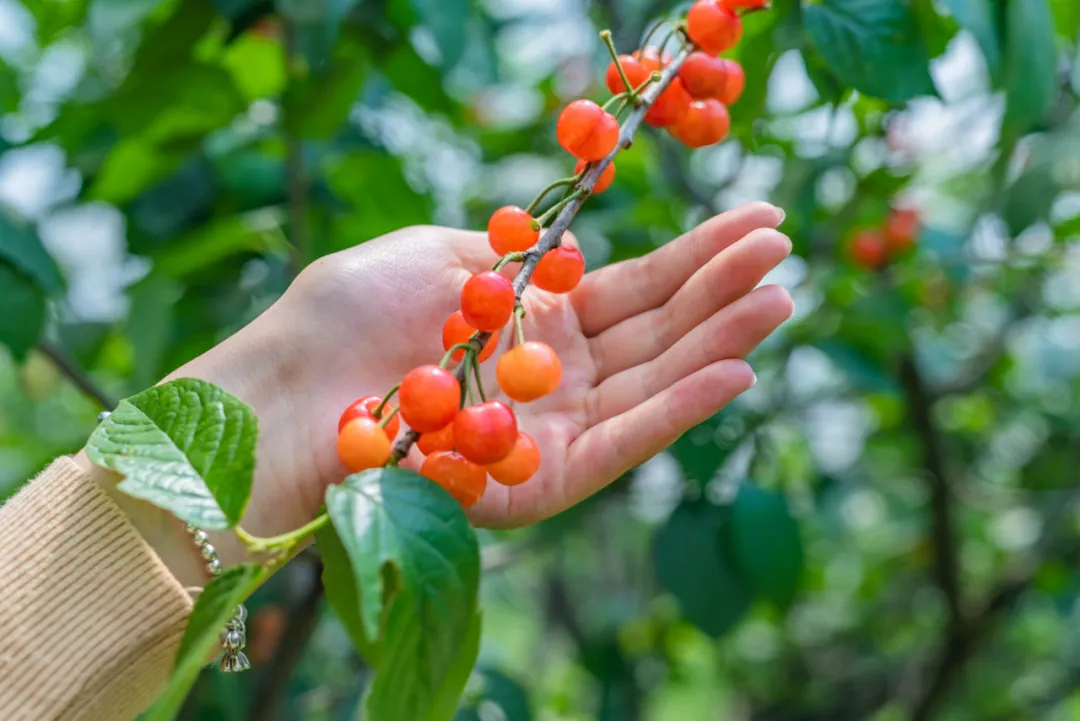 值得一提的是,黄陂区各大果园种植的均为本地优良品种——中华小樱桃。不同于进口车厘子纯甜的口感,中华小樱桃甜中带微酸,果肉软糯、汁水丰盈,富含铁、维生素C及花青素等营养物质,风味层次十分丰富。