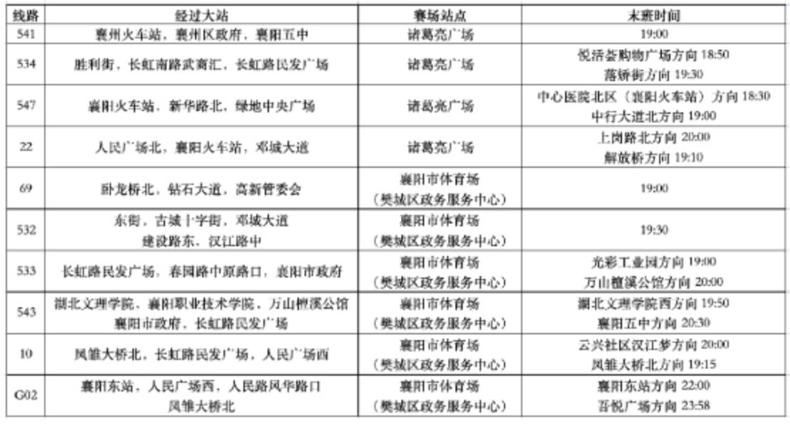联赛开始前,公交集团对途经诸葛亮广场站、万达广场站、襄阳市体育馆站的公交线路重点加密,具体为69路、541路、10路、22路、547路、G02路、533路、543路、534路、532路,观众可乘坐上述线路前往襄阳市体育场。