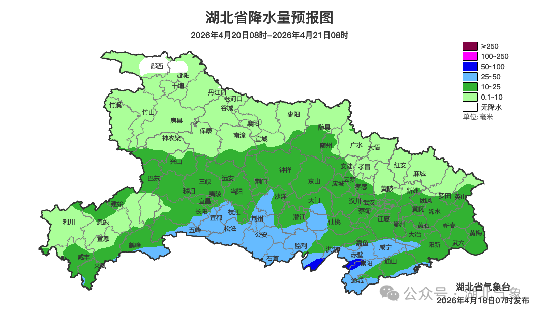 4月20日08时-21日08时,鄂西南东部、江汉平原南部、鄂东南阴天有中到大雨,局地暴雨伴有雷电;其他地区阴天有小到中雨。最高气温西部15~19℃、中东部20~26℃,最低气温10~15℃,偏北风4到5级、阵风6到9级。
