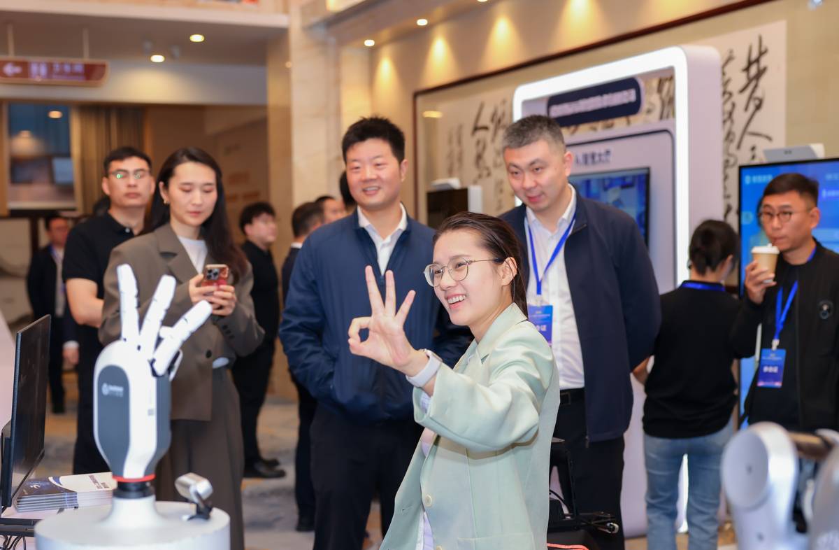 2026湖北人工智能产业发展生态大会上,机器手与嘉宾互动,模仿嘉宾动作“OK”。