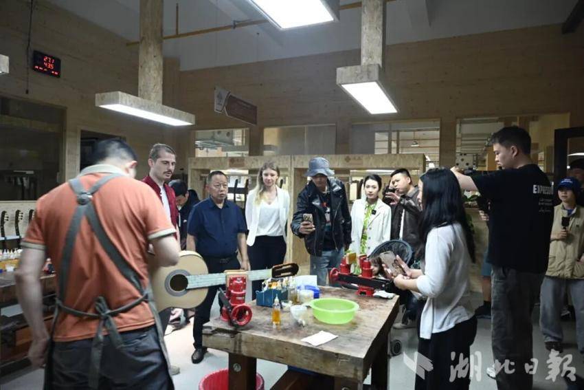 上午9点45分,青年博主们抵达市文化创新产业园。在观看城市宣传片后,大家走进桐馨乐器工厂,近距离观摩吉他制作的全过程,欣赏高端手工吉他,并与造琴大师深入交流,聆听每一把吉他背后的匠心故事。