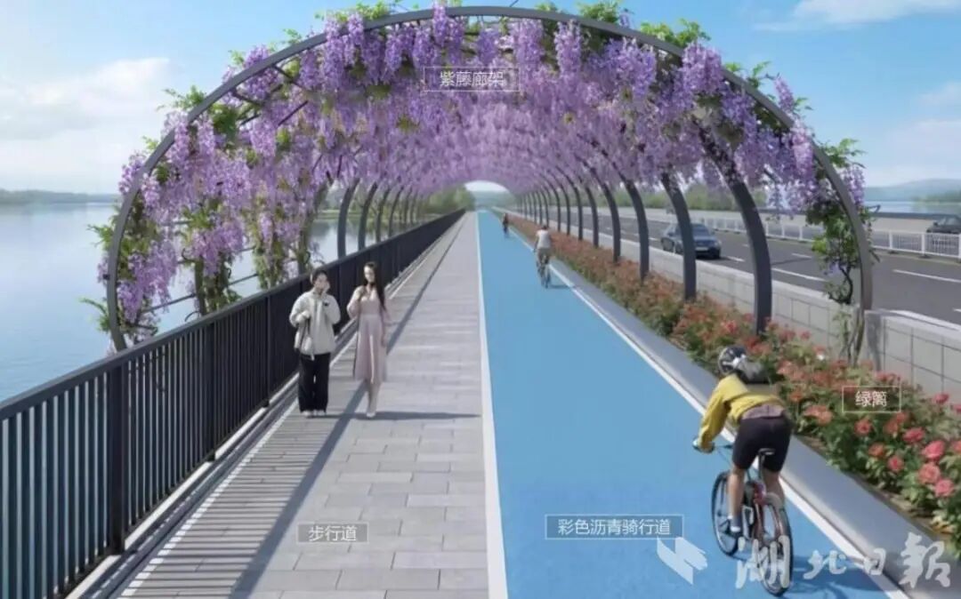 项目位于江夏区科技工作者社区核心范围,北起羊子山街、南至谭鑫培路,西临文化大道、东临创谷西路,总面积约106公顷,其中水域面积达90公顷,绿化面积11公顷。一期核心段全长约6公里,重点打造3.8公里环湖骑行道与4公里滨水步行道,二者以矮花箱软性隔离,骑行健身与漫步赏景互不干扰。沿线配建7000平方米健身活动场地、8处亲水平台,方便市民零距离感受湖光山色。