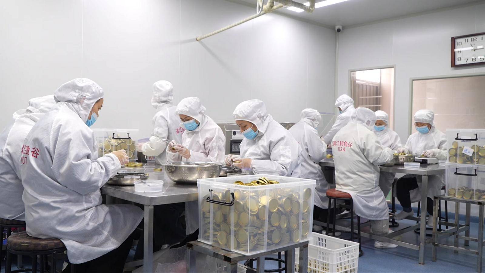科技赋能,不仅让养殖更绿色,更让产品品质与国际接轨。在清江鲟鱼谷无菌低温车间,鲟鱼鱼子酱从取卵到装罐的十多道工序,严格控制在15分钟“黄金时间”内完成,最大限度锁住天然鲜味。