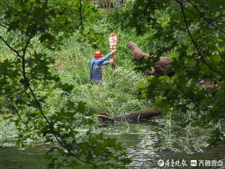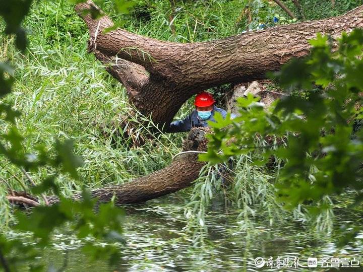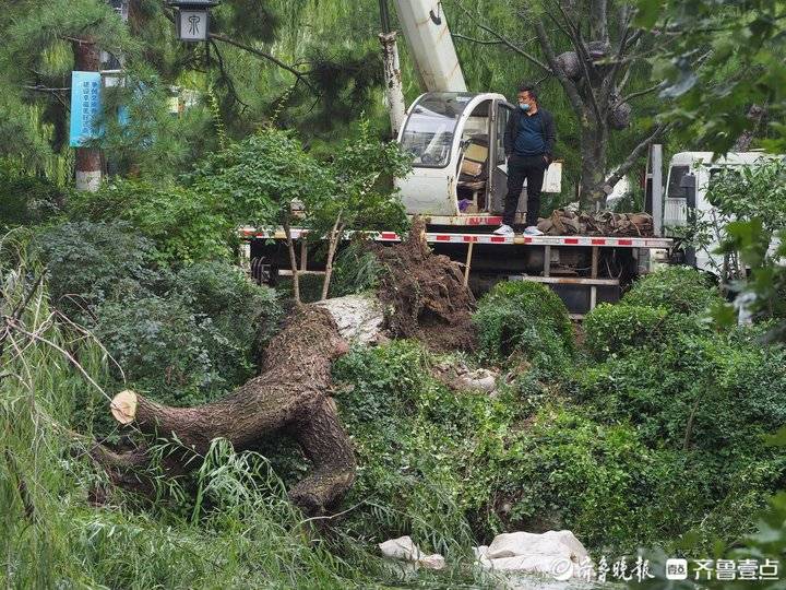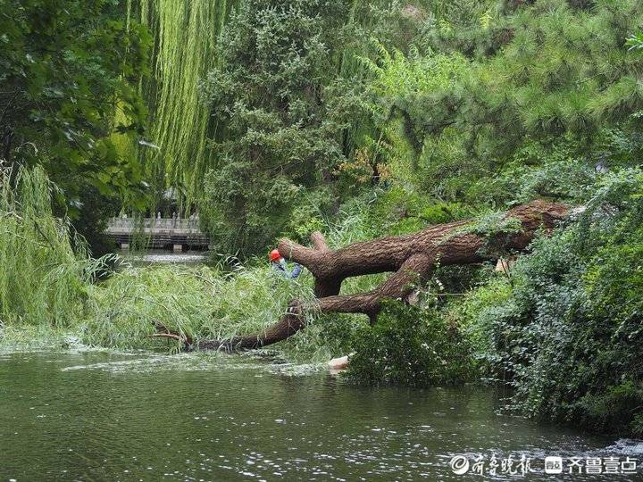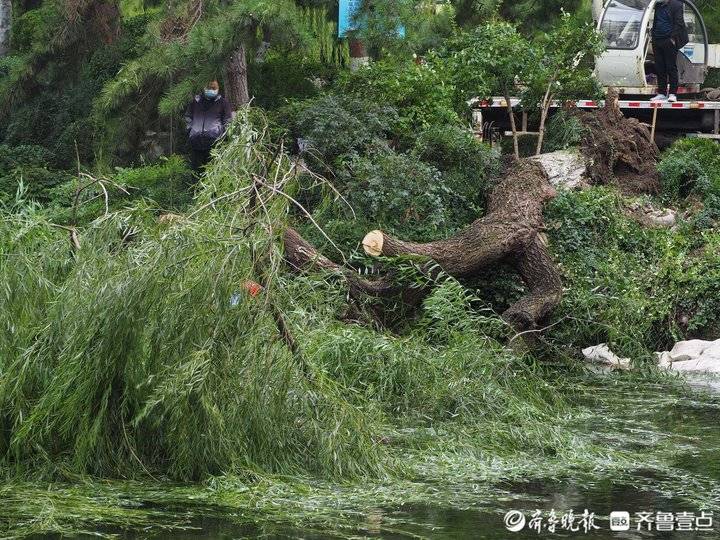 10月4日早晨,济南趵突泉景区,一棵巨大的柳树被风吹倒在泉池里。